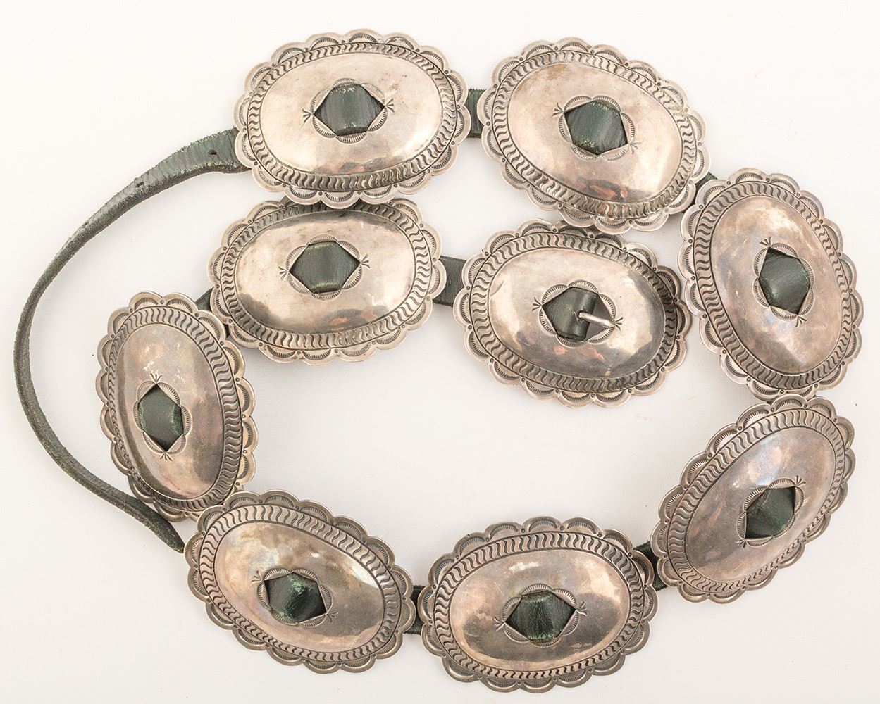 9 large(2.75" x 3.75") 1st phase style Navajo silver conchos on a leather belt. H. S. B. Navajo stamped on the rear of conchos. Very nice. State: City: Date: ID# 49253