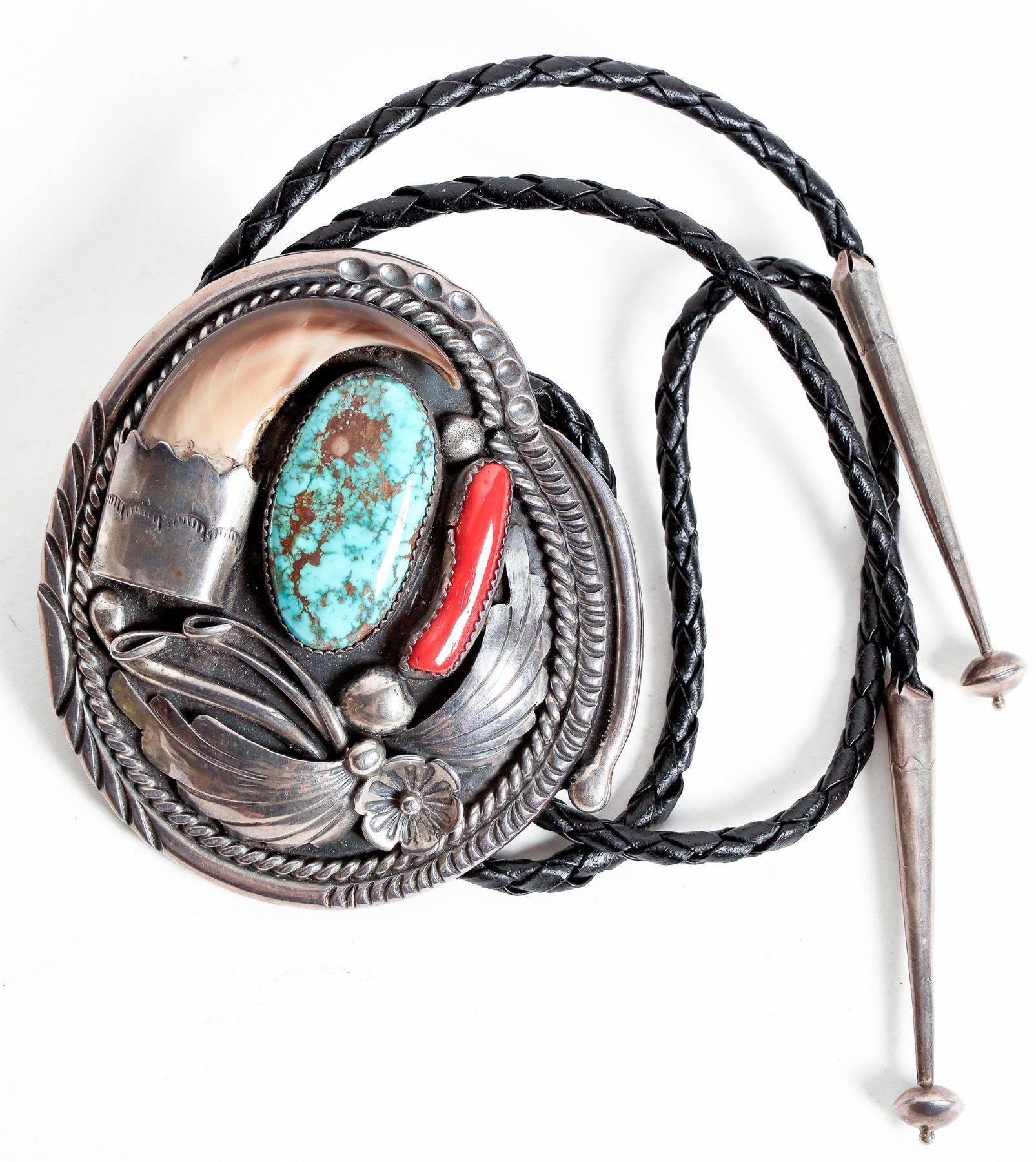 Turquoise (possibly Royston or Pilot Mtn) and coral with bear claw, silver floral design set in unique wire wrapped shadow box. Hallmarked with "T" and a symbol. 3" long, 3" wide. Black leather, with silver tips. From Frank Lewton Collection [Navajo Reservation] [Arizona] [] [] []