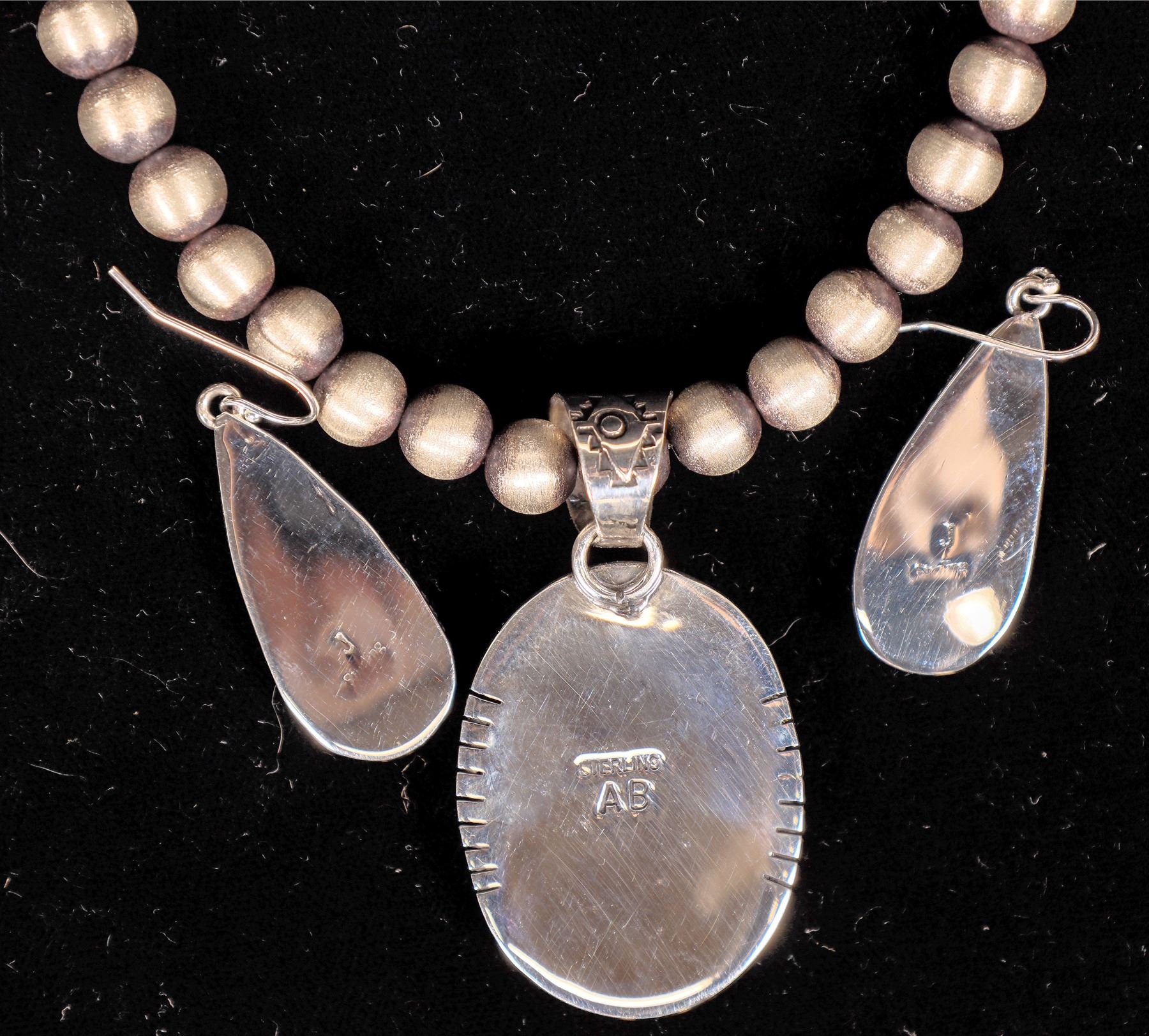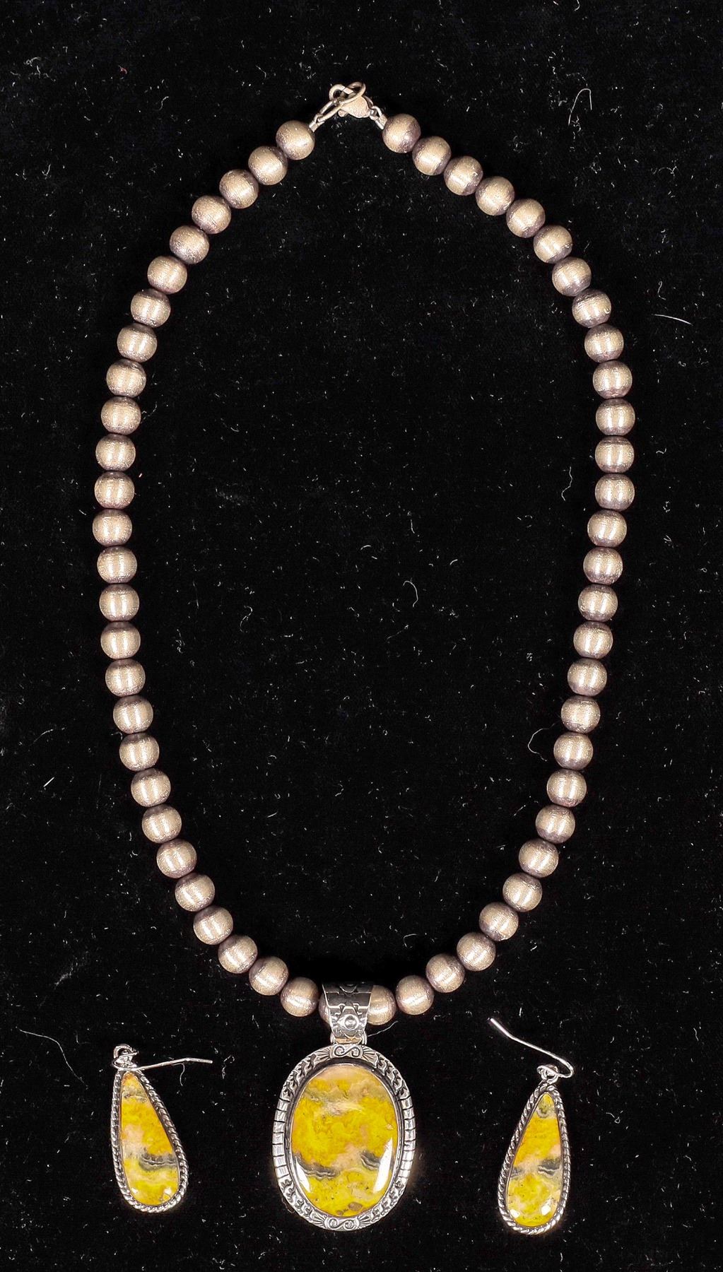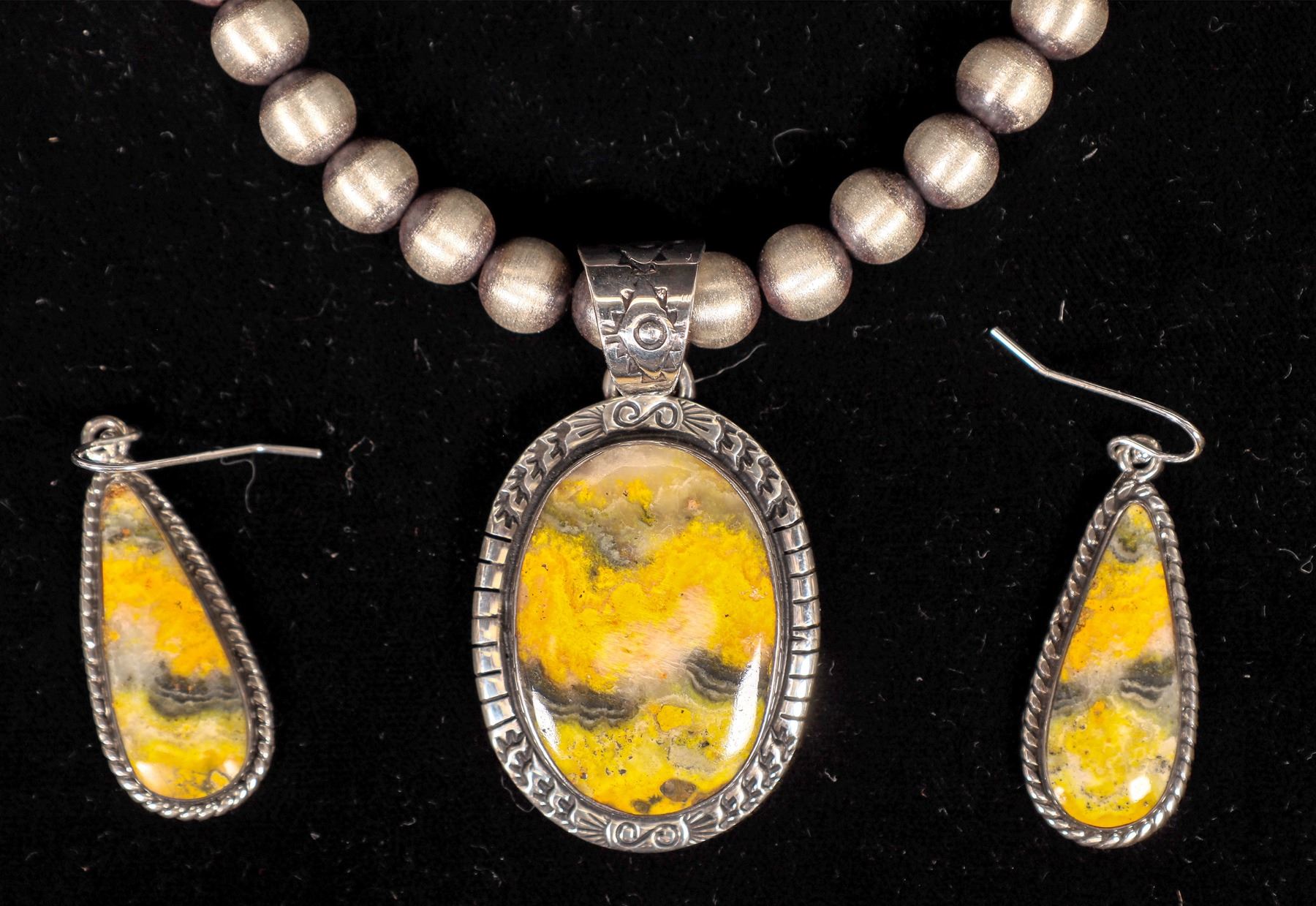 This is a very nicely matched Navajo made Bumble Bee Jasper necklace set presented on a strand of antiqued Navajo sterling silver pearls, the pendant measures 1 ½” tall with the bale and 1” across and signed AD, earrings are signed with a single T.