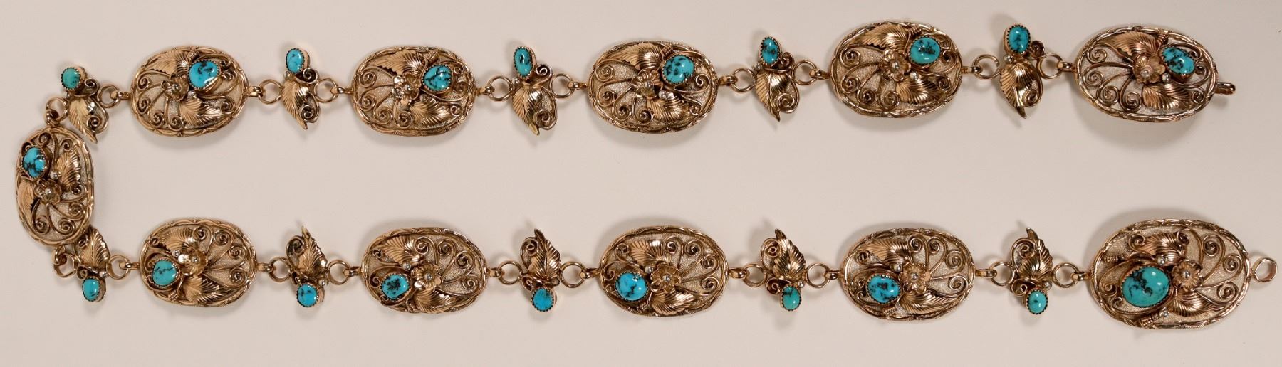 This is a beautiful concho belt signed by silversmith E. King and also marked 10K Gold Filled on sterling, King worked as a benchsmith for Don Mortensen in 1978 and for Sophie Cooper in 1983, his hallmark of E. King first appeared in 1978, a single turquoise nugget appears on each concho and spacer as well as the buckle turquoise appears to be that of the Bisbee Mine in South Eastern Arizona area, there are ten conchos and ten connecting spacers and a slightly larger buckle, the belt measures at about 34” in length.