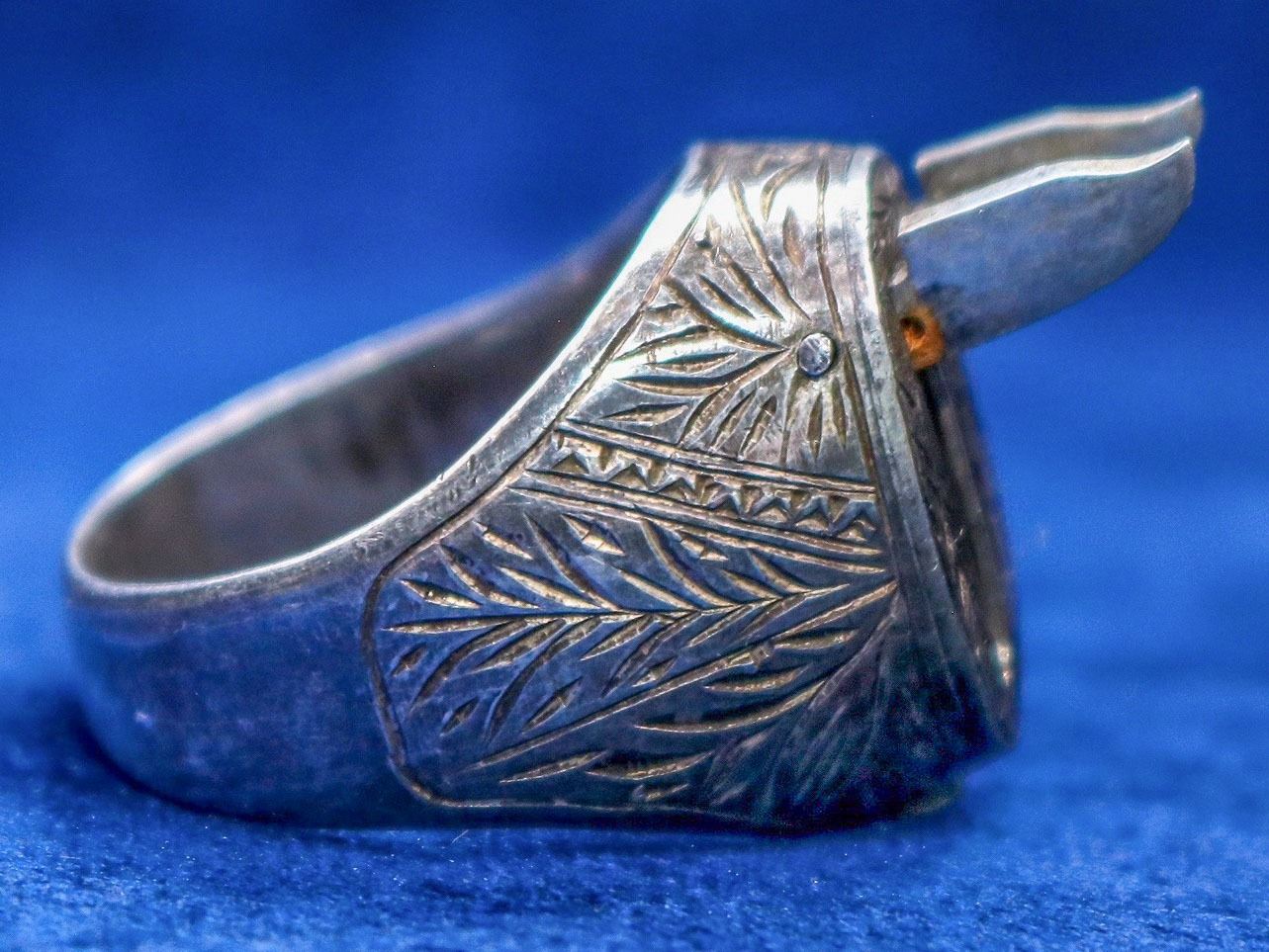 This may be one of the cleverest knives ever made. This is a beautiful Navajo silver ring, size 10.5/ 20.5mm with feather design engraving. The ring appears to have a bezel with the stone missing. But if you slip your fingernail under the tab it triggers two miniature clip point bowie knives. Each is about .5 in. long. This would be considered a self-defense jewelry-weapon. No visible hallmarks. Please see photos for details.