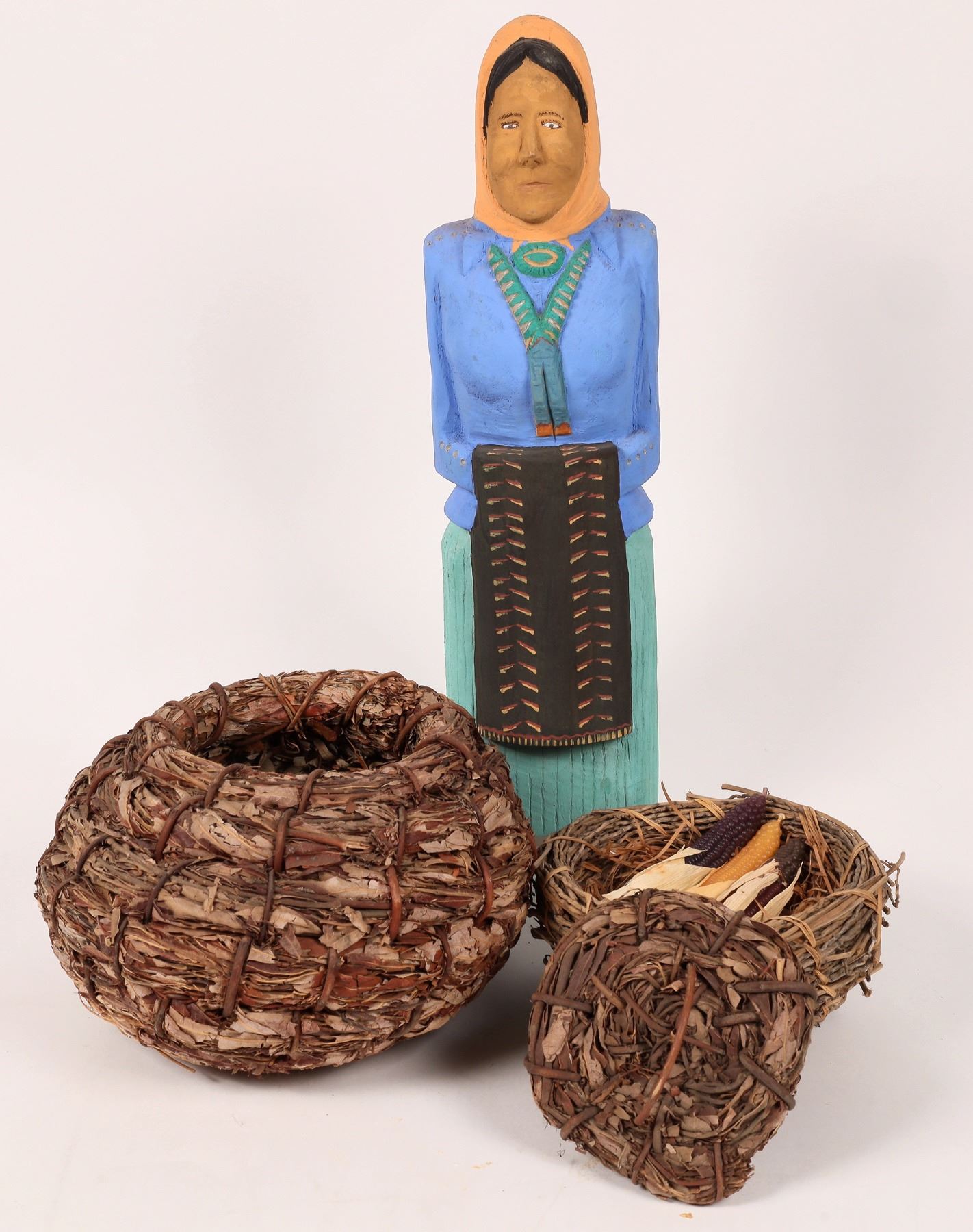 Carved wood Navajo lady with nice colors, signed Johnson Antonio -89- on left foot, 19.5" tall. 2 hand woven baskets- twigs with lid 3.75x6.5', woven leaves 5.5x9.5" Mexico