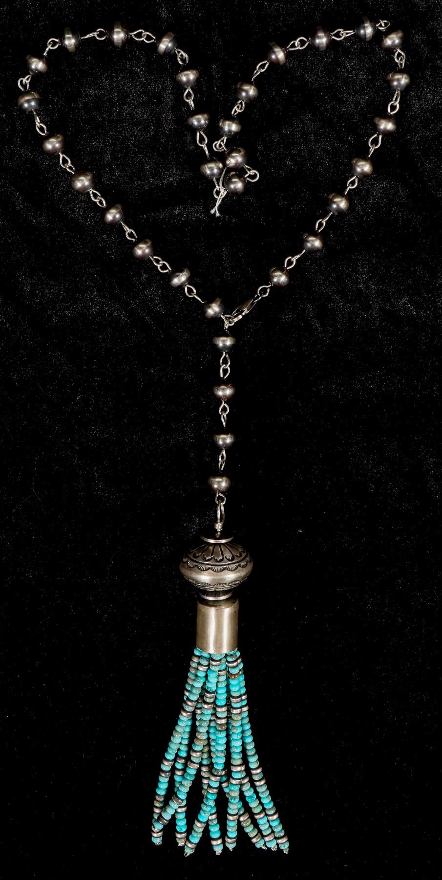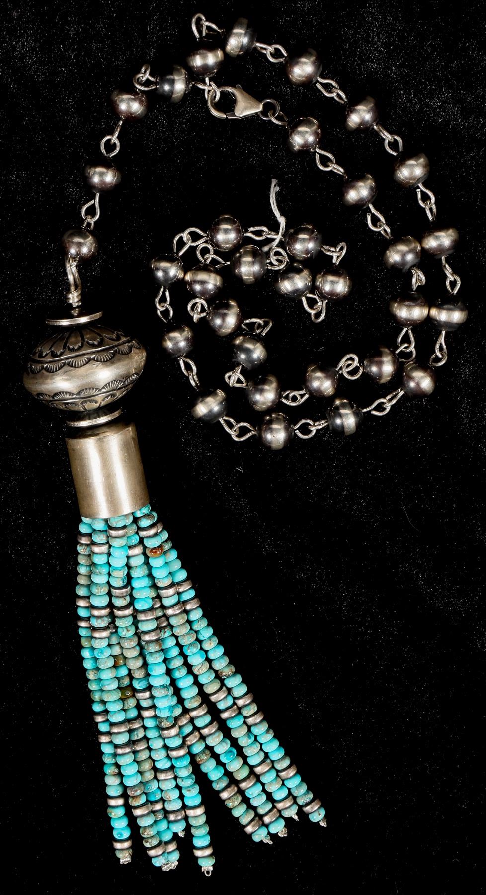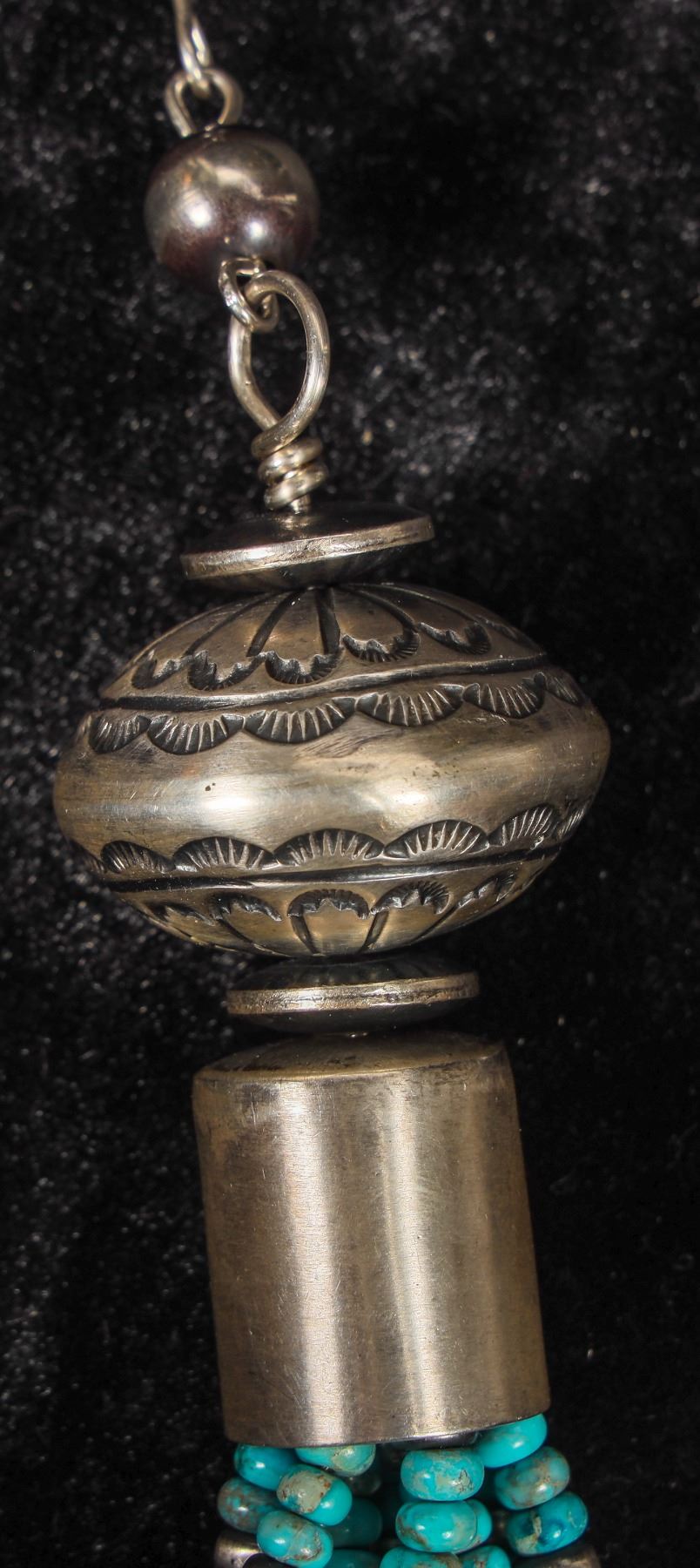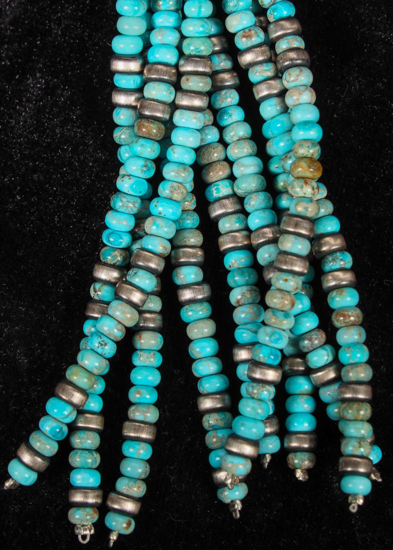 This is a Navajo made Lariat Style adjustable turquoise necklace, the sterling and turquoise piece at the base measures 5 .5" show casing nine 4" strands of beautiful turquoise with silver disc cut bead spacers all suspended from a set of antiqued Navajo Pearls, with a 3 bead drop from the necklace it measures 19" top to bottom but keep in mind that length is easily adjusted as desired based on the wearers preference, this is an outstanding statement piece.