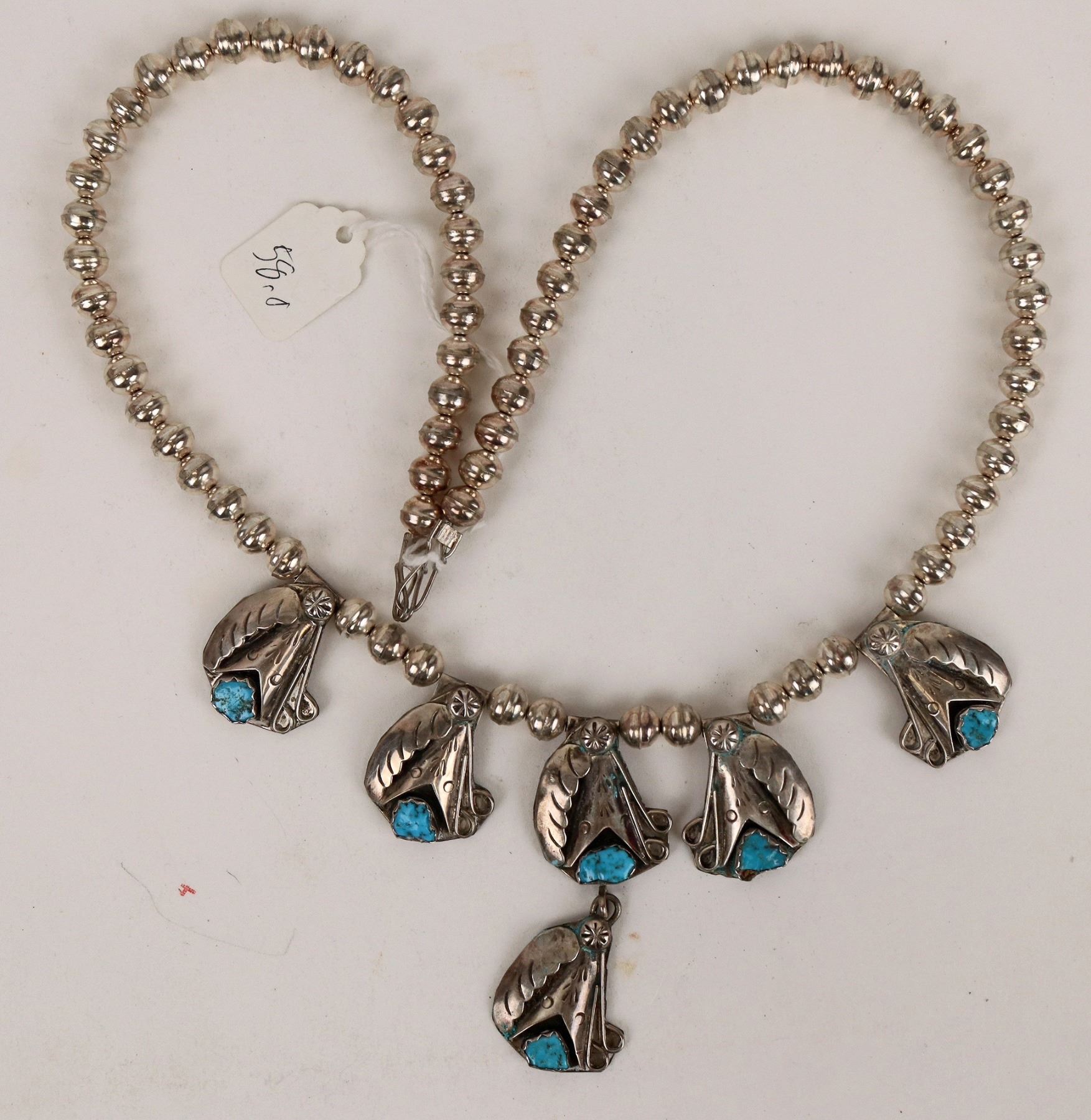 Silver Beaded Necklace-Unusual Flat Turquoise Accent Squash Blossoms Sterling silver beads with flat back, hanging turquoise squash blossoms. (6) hanging squash blossom flat back silver pieces, turquoise stones mounted on each. Weight is 58.0 grams total weight. Unusual design with unique accent pieces. Beaded strand is 12 in. long plus the two center hanging blossoms = 14.5 inches overall length. [