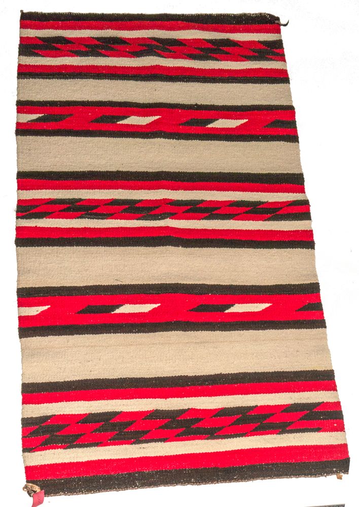 Beautiful wool rug, with dramatic traditional colors and patterns. Vivid red, white, black & brown bands, with the famous serrated pattern. The rug measures 30"x60". Excellent condition.