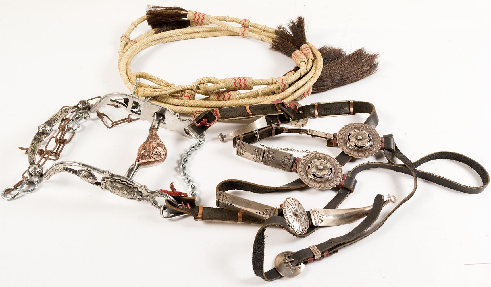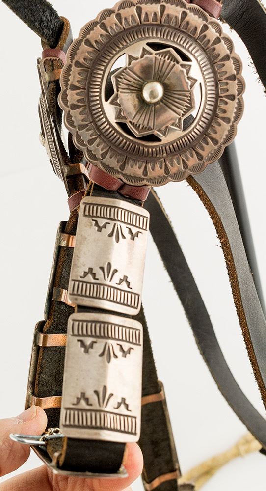 1930-1940's. Navajo. Braided and tassel reins. Contemporary silver bit with copper barrel on the underside of copper upper. Multiple silver conchos, 1 has a turquoise inlay. Some later hardware. Consigned by The Cowboy Connection in Livingston, MT. State: City: Date: ID# 49246