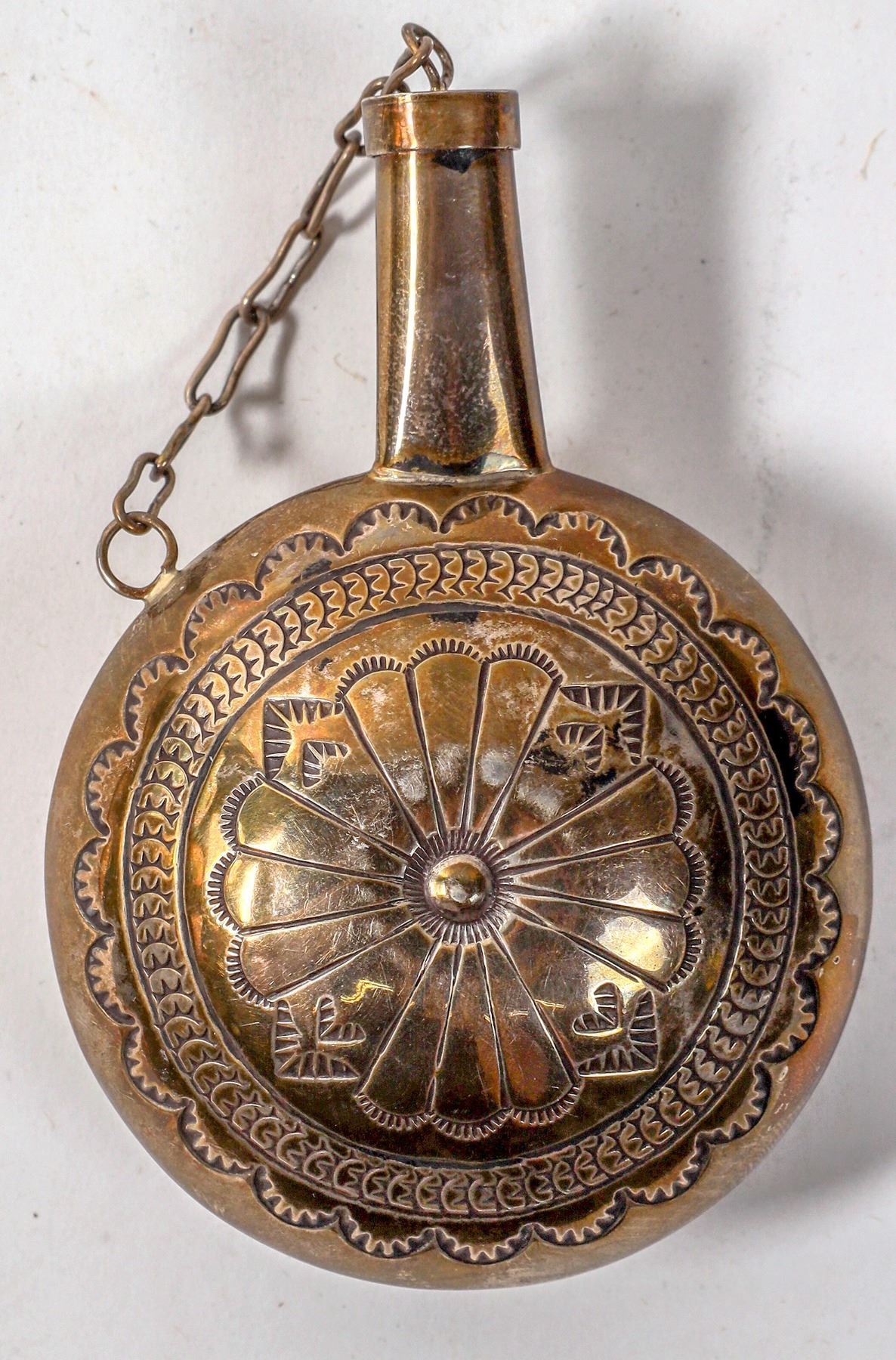 Ornate silver whiskey flask, possibly Navajo. No maker mark. Gap with chain.3.75x2.75".