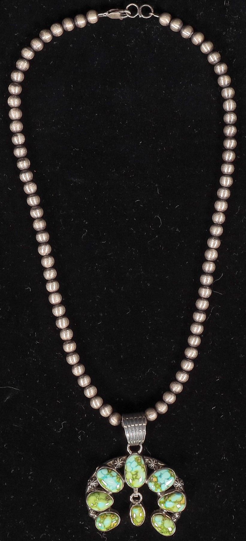 Another great piece of the very popular Sonoran Gold Turquoise set in a sterling silver pendant by Navajo maker Thomas Francisco, this piece is signed and features eight Sonoran Gold Turquoise stones with a hanging center stone, the piece is showcased on a 16” strand of antiqued sterling silver Navajo pearls.