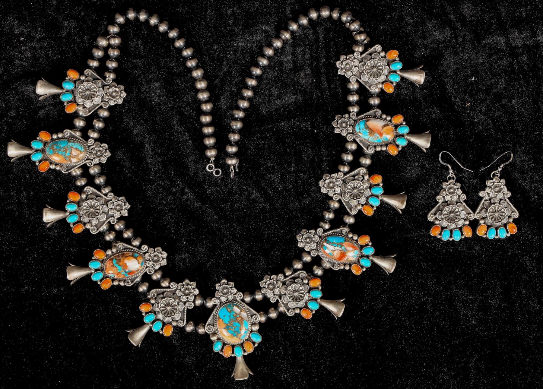 This is a Navajo made squash blossom with matching earrings, the main elements are turquoise and spiny oyster and five larger composite stones combining both the turquoise and spiny oyster together with hints of a copper colored matrix and all set in sterling silver, hallmark is G. James, an exquisite piece, measures 16" top to bottom.