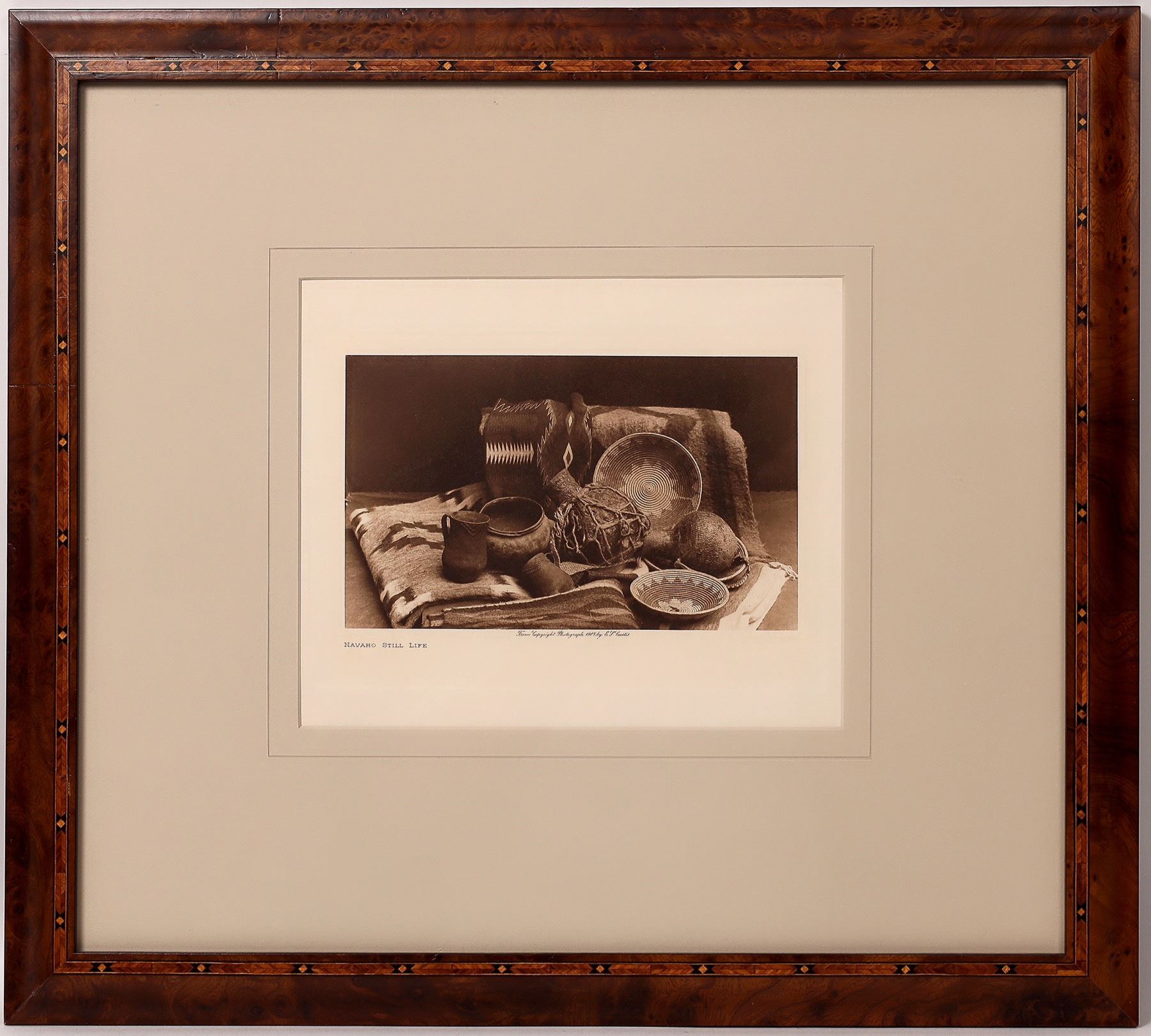 Engraved sepia-tone print titled "Navaho Still Life" by E.S. Curtis. This print was made from an original photograph copyrighted in 1907. Edward S. Curtis was an American photographer and ethnologist who focused on the American West and Native American culture in his work. This print is professionally matted and framed in a burl maple frame. Overall size is about 19.25 x 17.25 inches, very good condition.