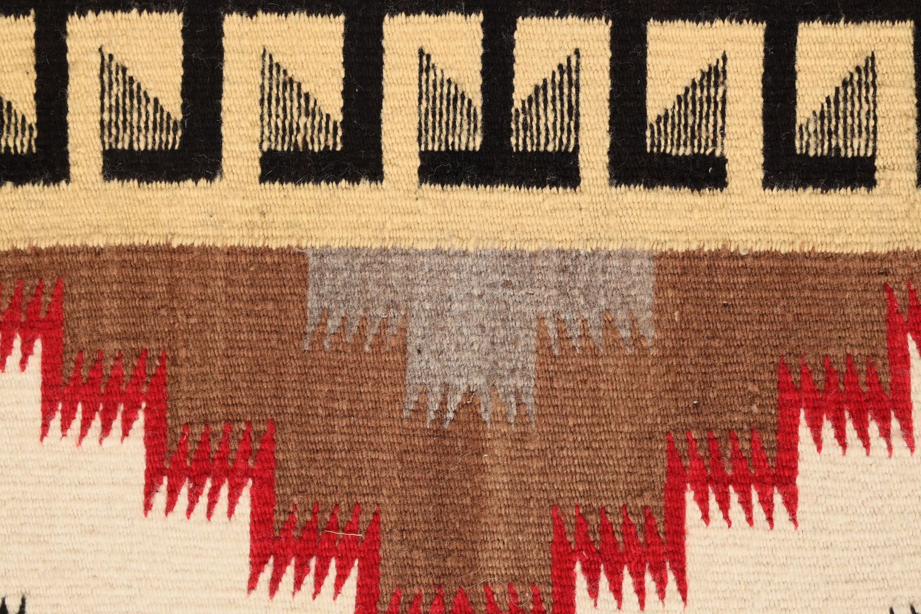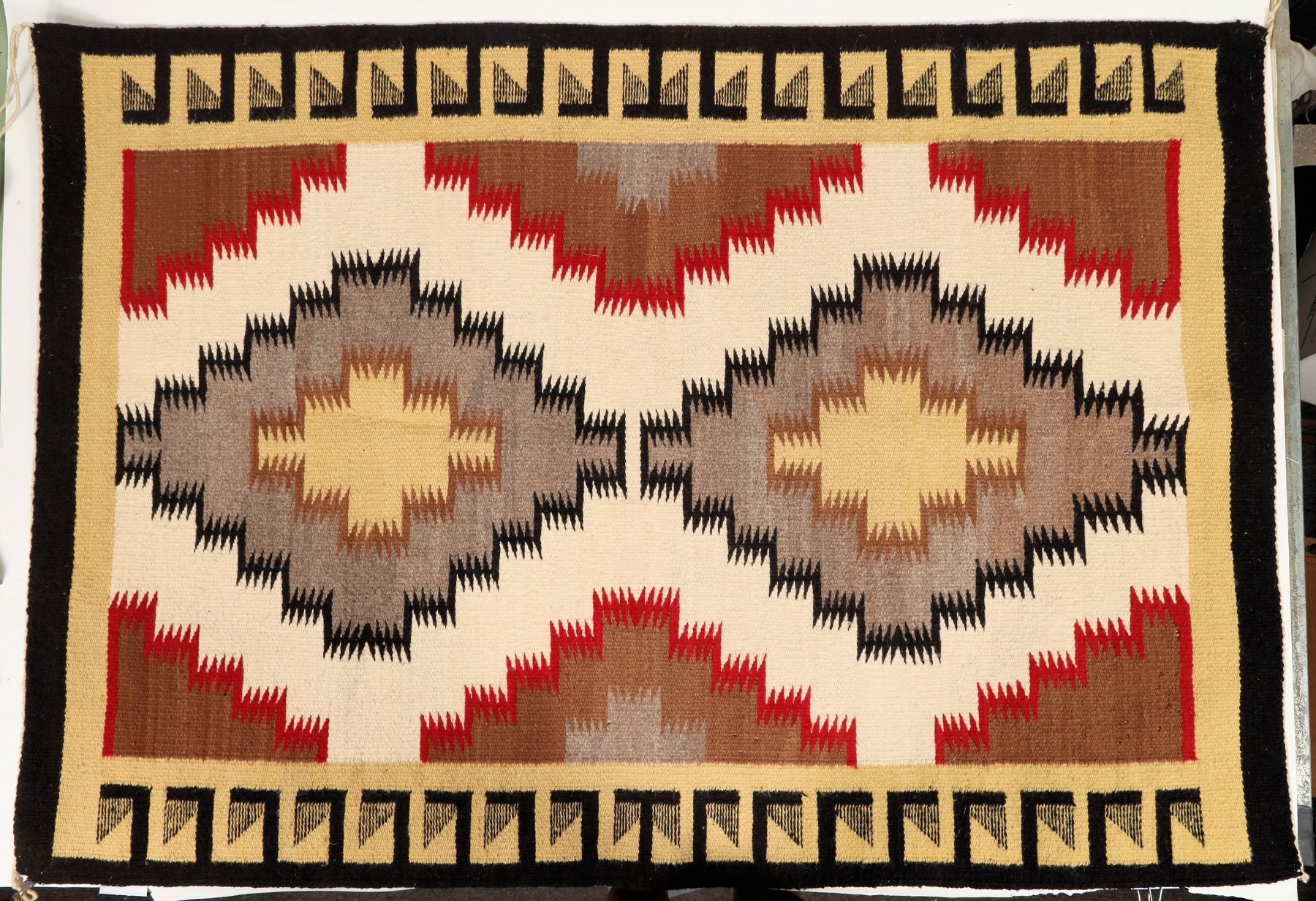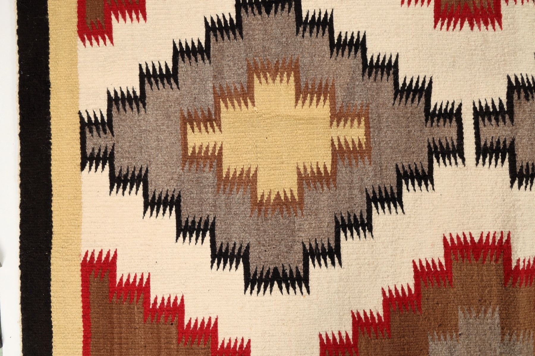 Navajo tapestry woven from native wool on a primitive loom, colored with natural dye. Made by Alma Williams, a skilled traditional Navajo weaver born February 5, 1918, died February 19, 2001 at the age of 83. 1936 Fred Harvey tag. Some few areas of moth damage. Very clean. Measures about 36x51". See photo.