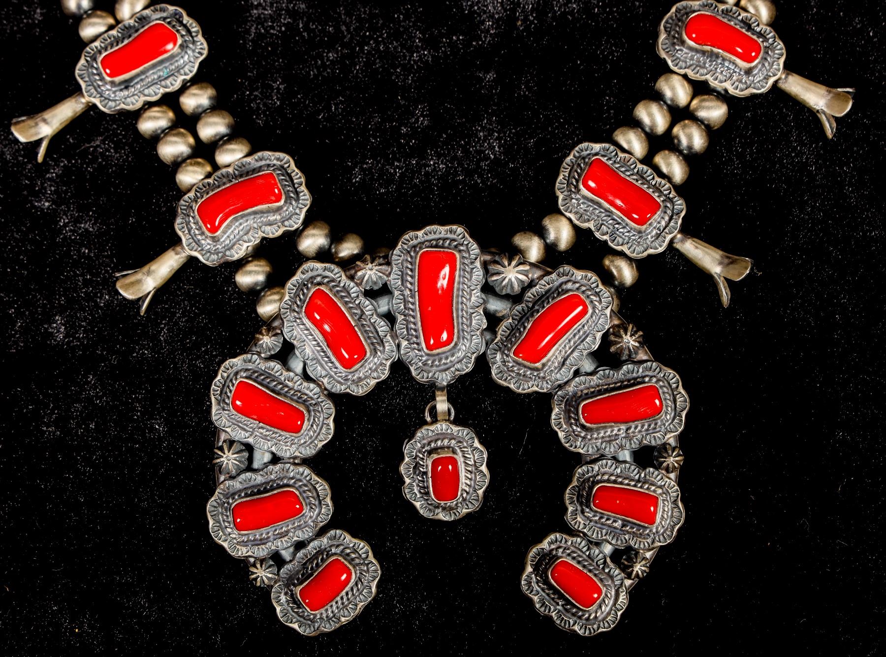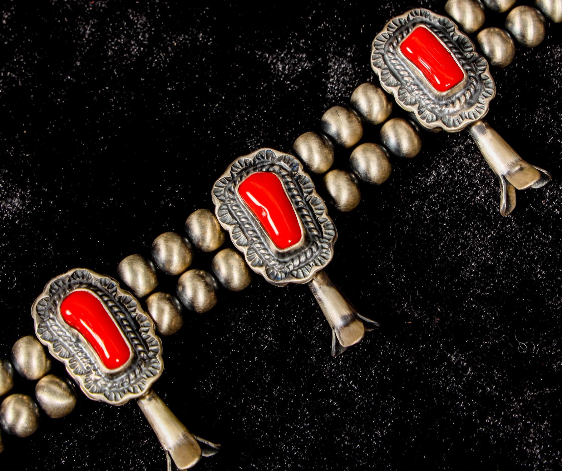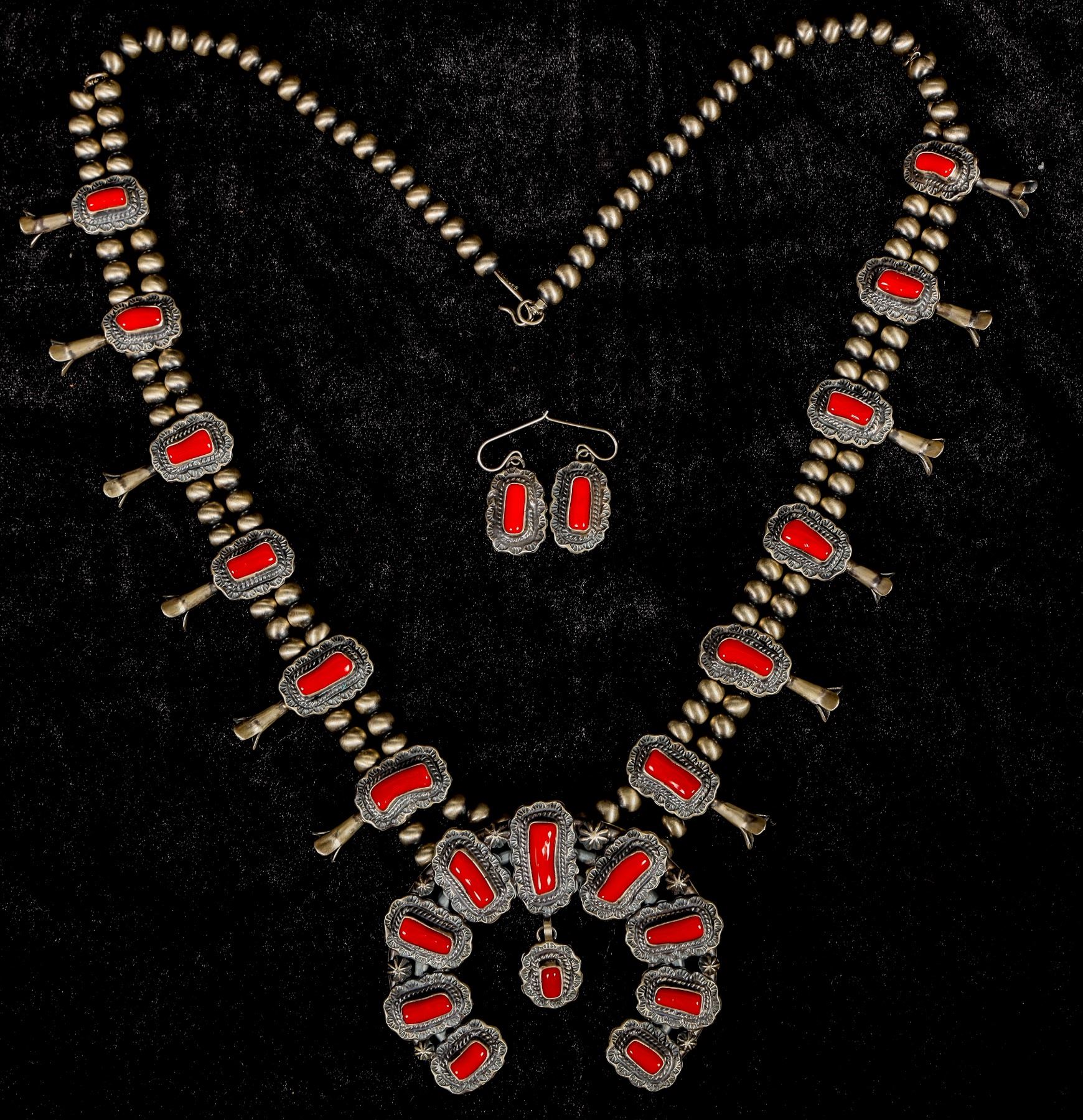 This is a Navajo made coral squash blossom set by silversmith Thomas Francisco, the piece is signed, the squash blossom contains 22 pieces of blood red coral accompanied by sterling silver antiqued Navajo Pearls, top to bottom measures at about 16 ¾" the Naja at the base is 3" across at center and about 2 ¾" tall, matching coral earrings accompany the piece.