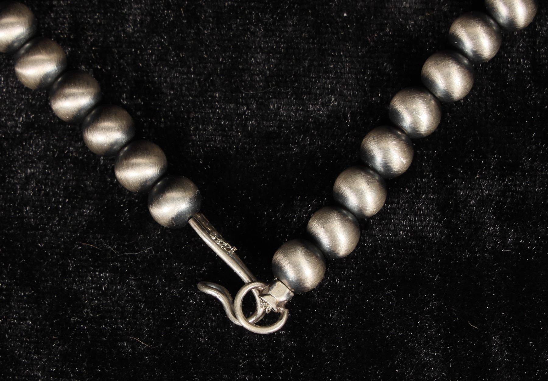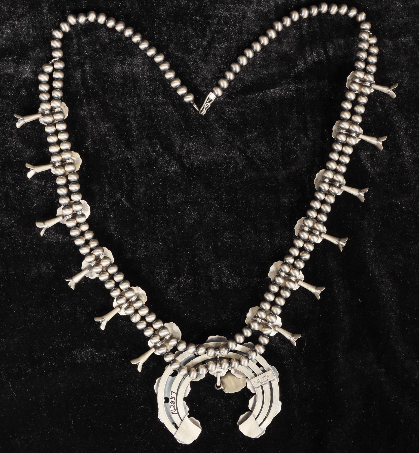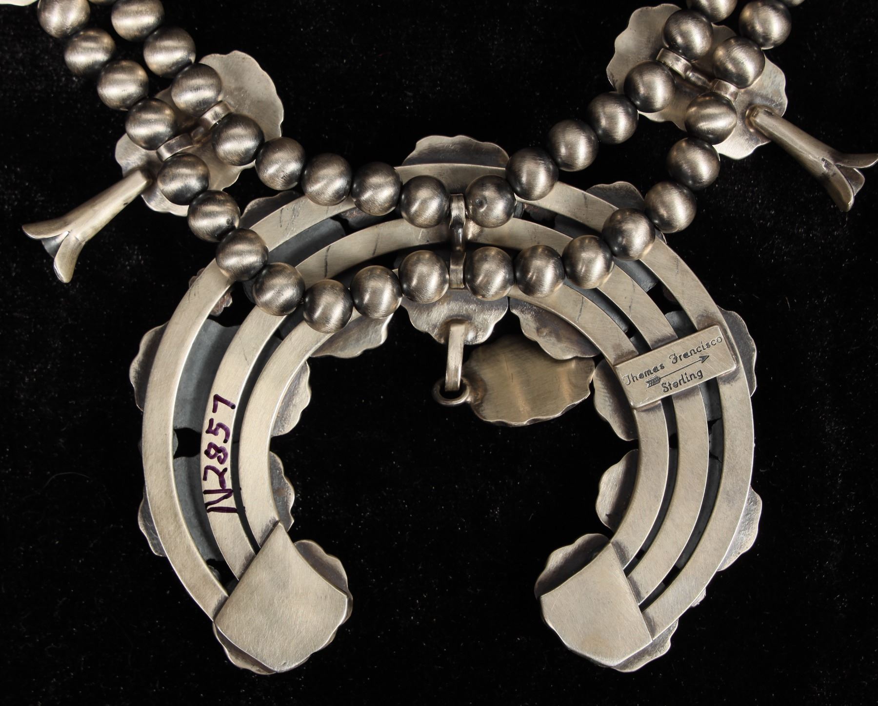 This is a Navajo made coral squash blossom set by silversmith Thomas Francisco, the piece is signed, the squash blossom contains 22 pieces of blood red coral accompanied by sterling silver antiqued Navajo Pearls, top to bottom measures at about 16 ¾" the Naja at the base is 3" across at center and about 2 ¾" tall, matching coral earrings accompany the piece.