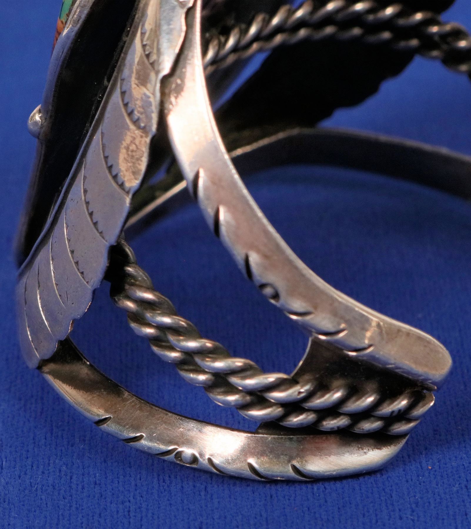 This Navajo turquoise cuff has one large central turquoise stone which strongly resembles the Turquoise produced by the Easter Blue Mine northwest of Tonopah, Nevada, the stone is also very similar to those coming from the nearby Royston Mines and at Pilot Mountain , the stone measures 2 ¾” tall by 1 ¾ “ across and is flanked by beautiful heavy silver work in the shape of feathers, the cuff weighs in at about 10 oz. and contains a marking of EA on one end of the cuff and a wavy line with an upward swing at the end located on the opposite end,cuff opening is 1 ½ “ wide.
