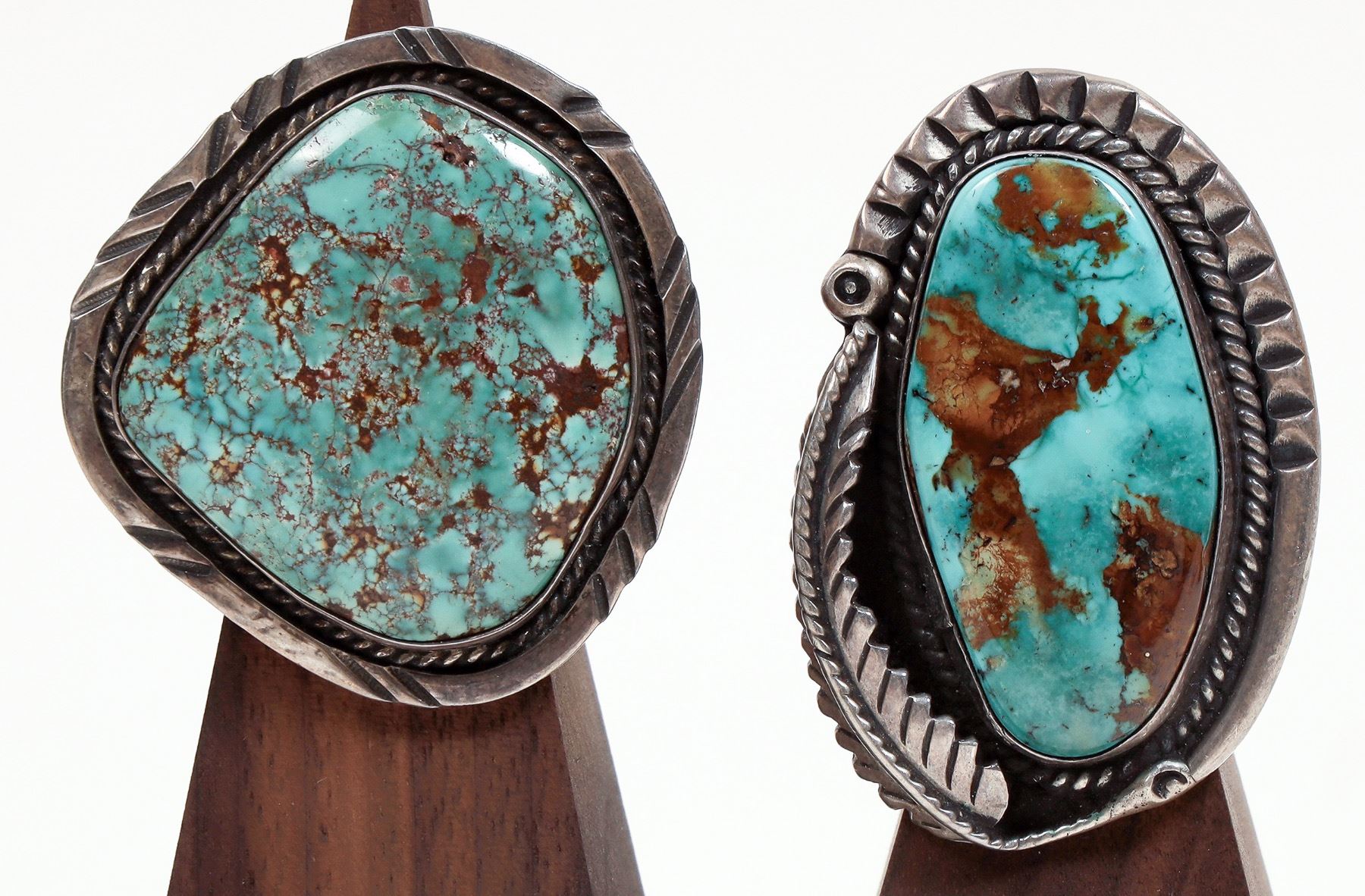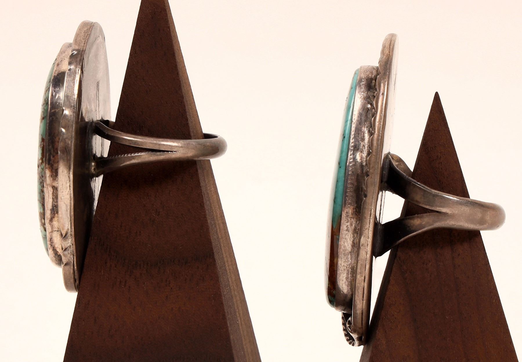 Two men's large Navajo turquoise rings with brown matrix (1) size. 6.5, stone and setting 45 mm x 35mm; (2) size. 9.25, stone and setting 40 mm x 40 mm. Frank Lewton collection.