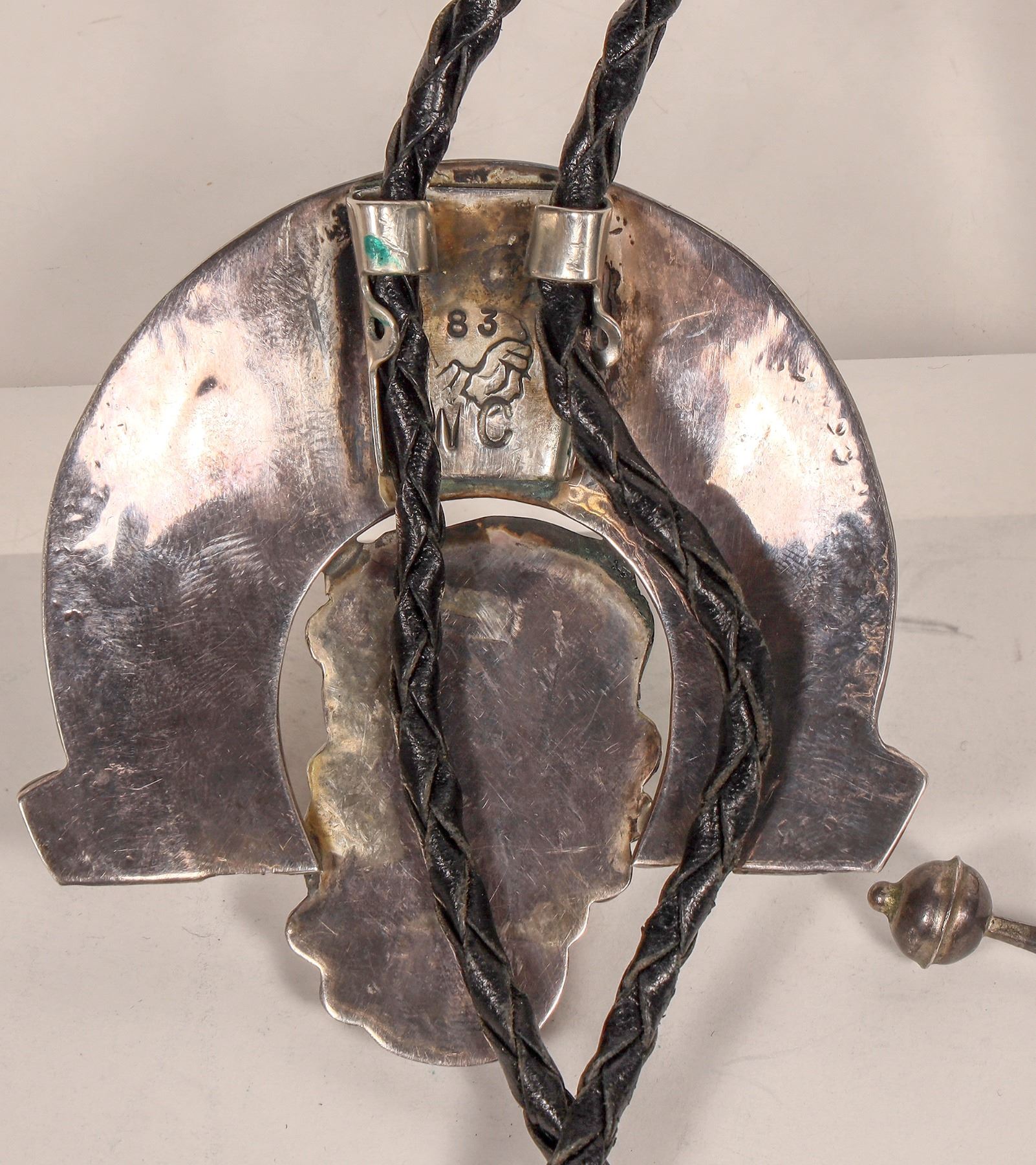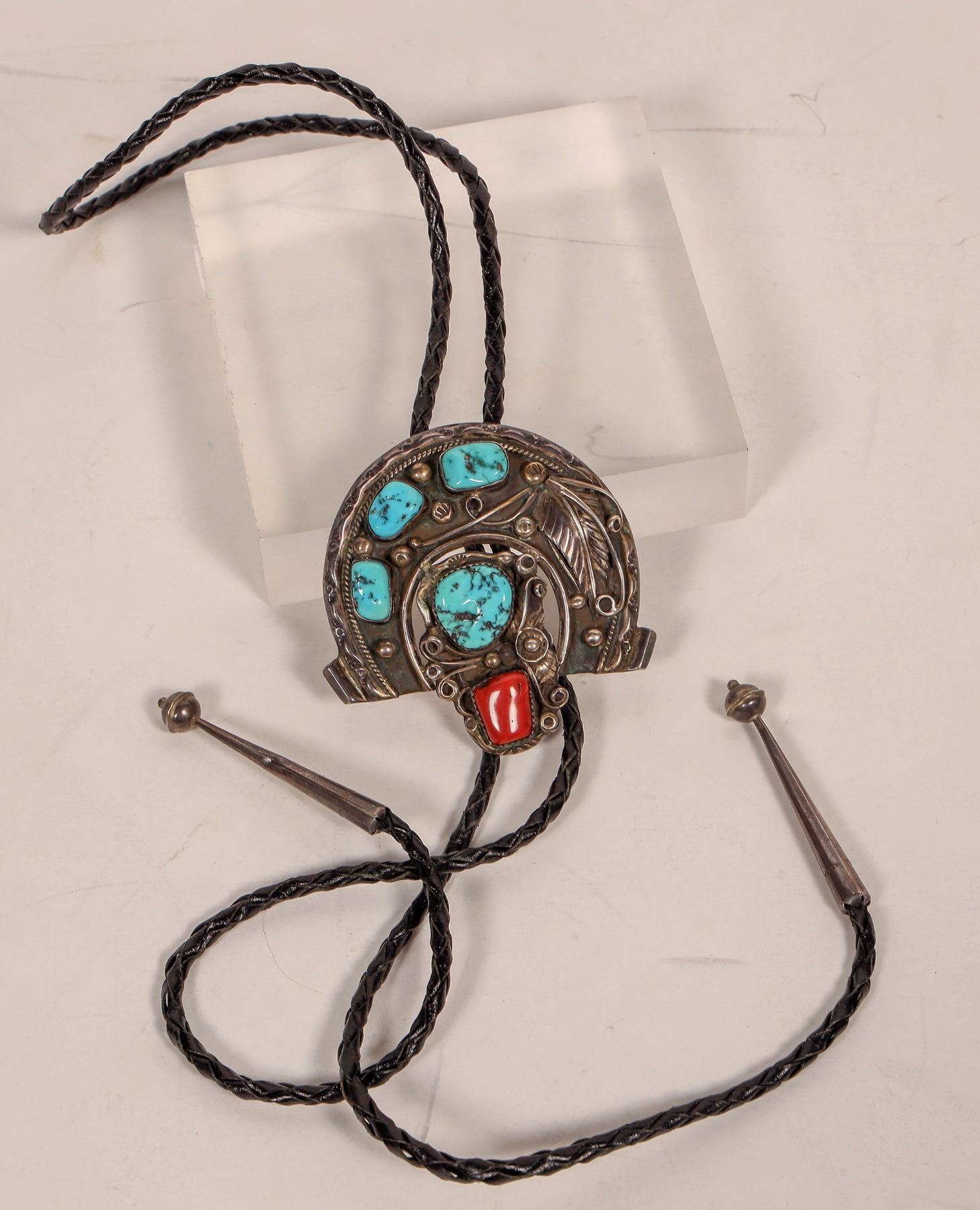 This is a vintage Navajo made bolo tie with 4 nice Bisbee turquoise nuggets and a piece of dark red coral all set in sterling silver with a leaf motif, looks to be from the mid 70s/ 80s and measures about 2 5 x 2.5", this is a signed piece with a WC hallmark and could possibly be the work of Navajo Wesley Craig who did sign with a WC, a piece of the Bennett clasp use to secure the bolo strings is missing.