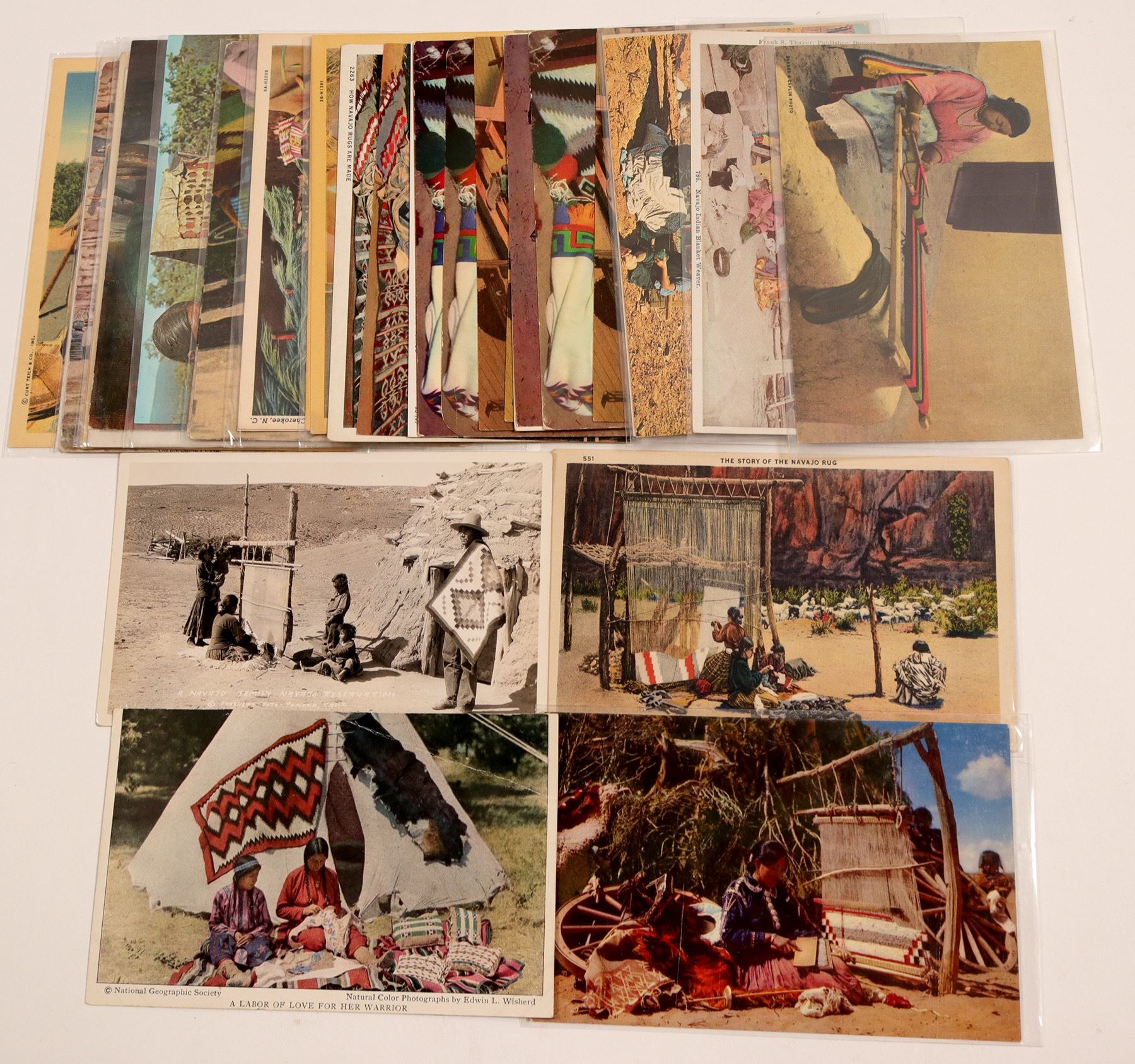 18 weaver photographs plus 8 duplicates and 5 basket photographs plus 3 duplicates, totaling 34 color and black and white postcards. Many workers are making rugs and baskets outside with colorful materials.