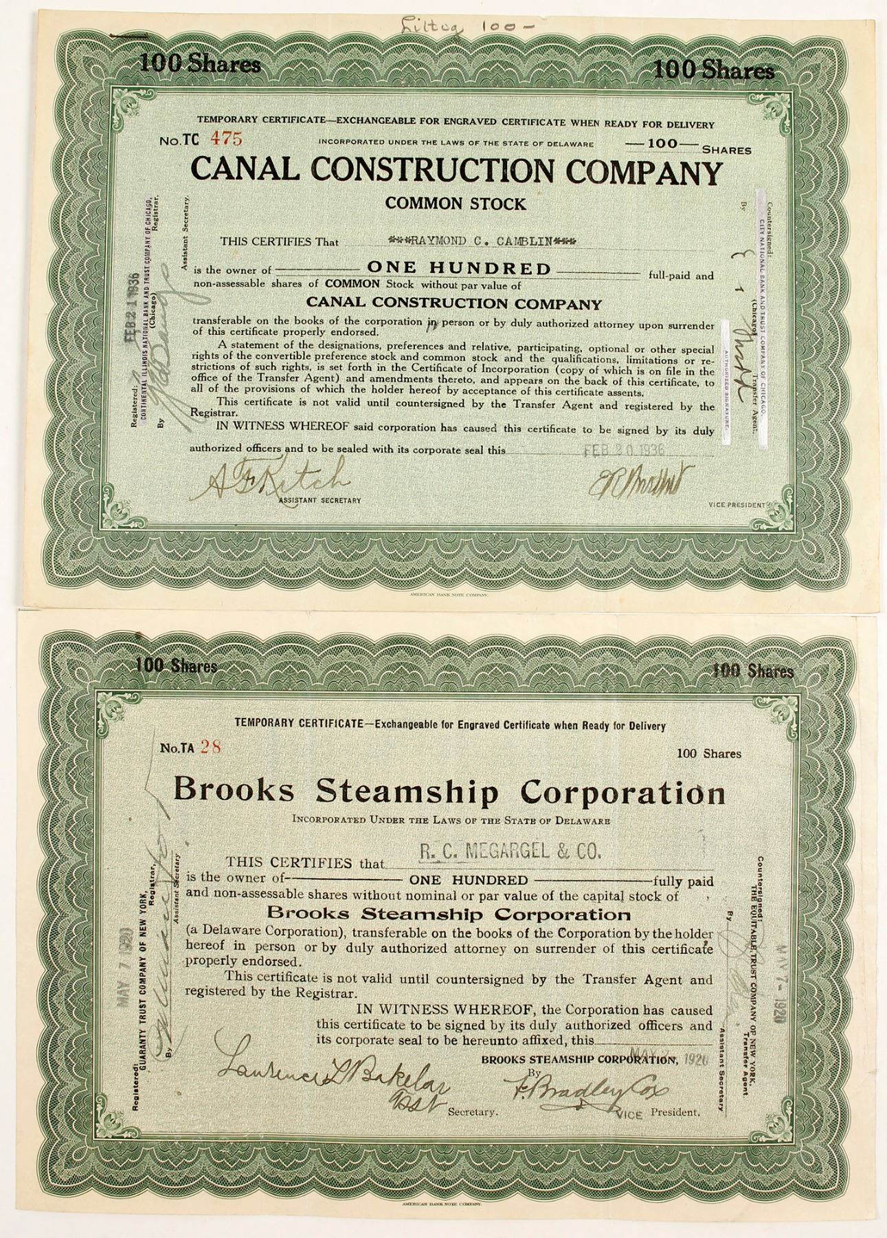 2 I/U. Canal Construction Co #475 Raymond Camblin 100 shares 1936 signed by VP illegible. Brooks Steamship Corp #28 RC Megargel 100 shares 1926 signed by VP Cox. Prag Collection.
