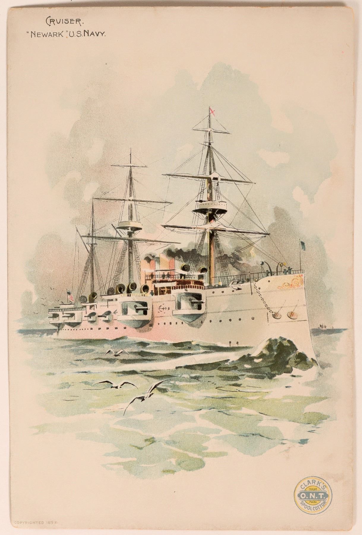Unique advertisement card featuring the Cruiser "Newark" of the U.S. Navy. Copyrighted 1892. Advertisement for Clark's O.N.T. Spool Cotton, Crochet Cotton, Darning Cotton, Milward's Helix Needles & Marshall's Linen Threads. See photos for the beautiful artistic rendering of the ship.