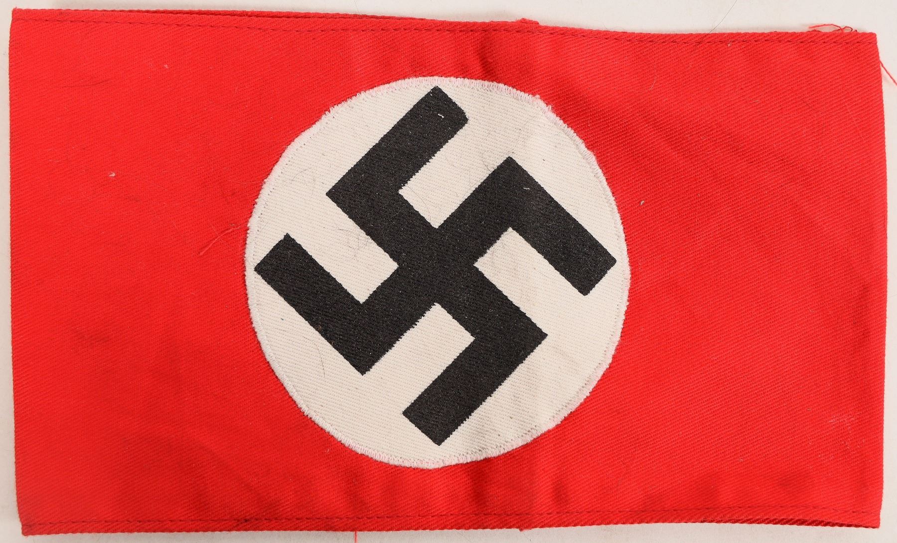 This is an original WWII Nazi swastika armband in unused condition at 19.25 in. X 4.5 in. red background, black border, the swastika in black over a white nylon background. Please see photos for more details.