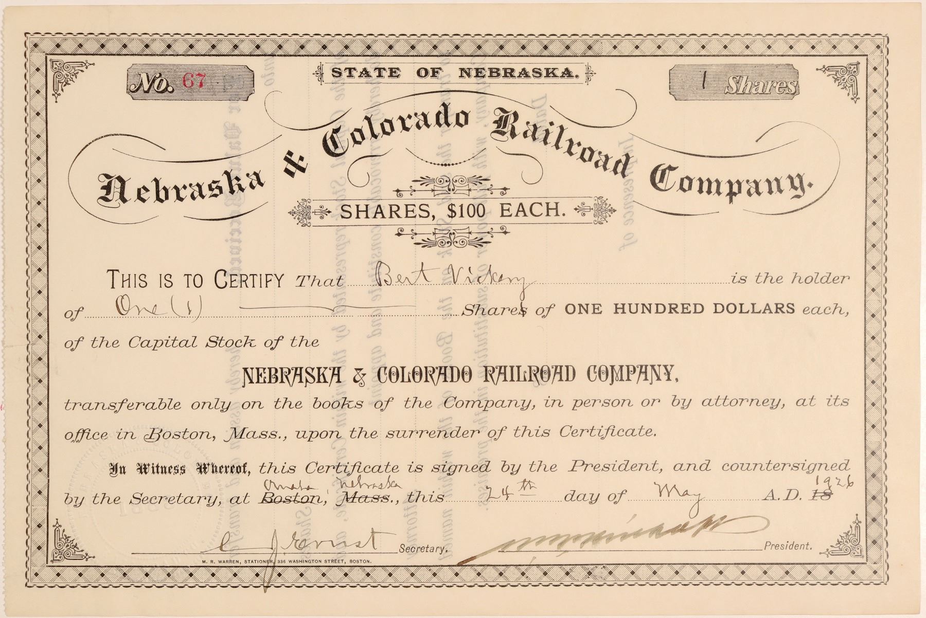 Stock Certificate from the Nebraska & Colorado Railroad Co. Incorporated in Nebraska. Certificate number 67 issued in 1926 at Omaha to Bert Vickery(?). Signed by president (?) and secretary Ernst. Printed by M. R. Warren. Size 10.375 by 6.875 inches. In Nice condition, Not cancelled. Black ink on ecru onionskin paper with a crisp embossed seal over the lower left portion. No evidence of folds, all edges and corners intact. Left edge shows perforations where it was torn out of the original binder. Printed place of issue is Boston, Mass., but this has been crossed out and replaced with Omaha, Nebraska. Same illegible signatures as appear on Burlington and Colorado RR and the Colorado and Wyoming RR certificates. Organized in 1883 for the construction of a railroad from Beatrice, Nebr., to the Nebraska-Colorado state line, together with branches from Strang south to Chester, from Strang north to Fairmont, from Edgar south to Superior, from Holdrege south to Oxford Junction, and from Holdrege northeast to Kenesaw.