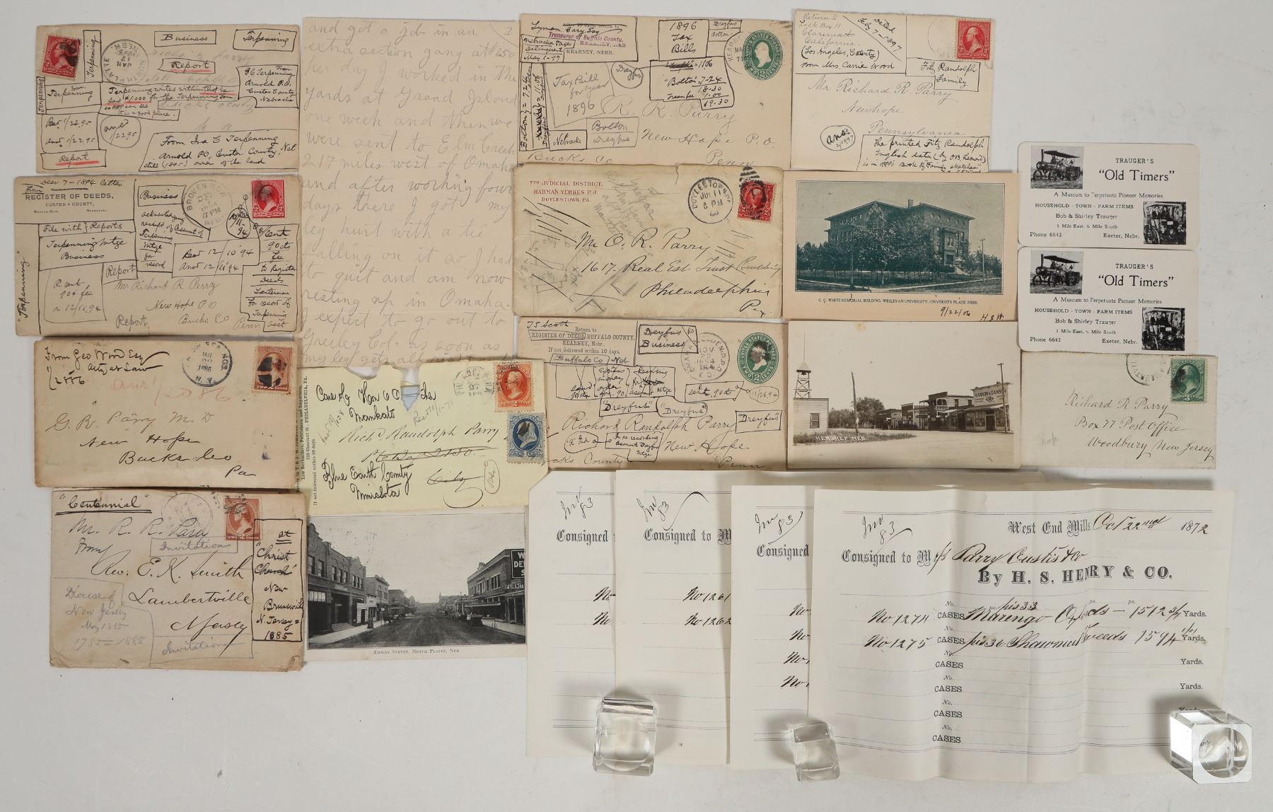Lot of 16 .Richard Randolph Parry (1835-1928) is mentioned in the Who's Who of Pennsylvania. Prominent citizen and early family of New Hope. He was president New Hope Delaware Bridge Co., Dry Goods Commission Merchant New York and Philadelphia, Life member Historical Society of Penn. since 1855, and several other historical societies. The correspondence is from several judges, Registrars of Deeds, Treasurers . There are two RPPC : one of North Platte and of Hershey, Neb Main street. Two members cards of "Traugers Old Timers" museum Exeter, Neb. Various conditions.