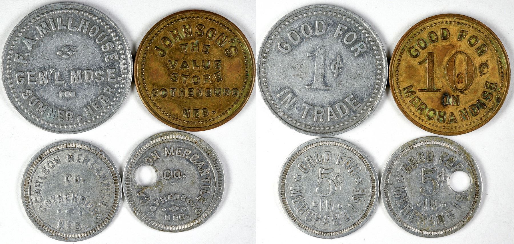 Lot of four: Sumner (1): F. A. Millhouse (R5); Gothenburg (3): Johnson's The Value Store; Carlson Merchantile (2 - one holed).