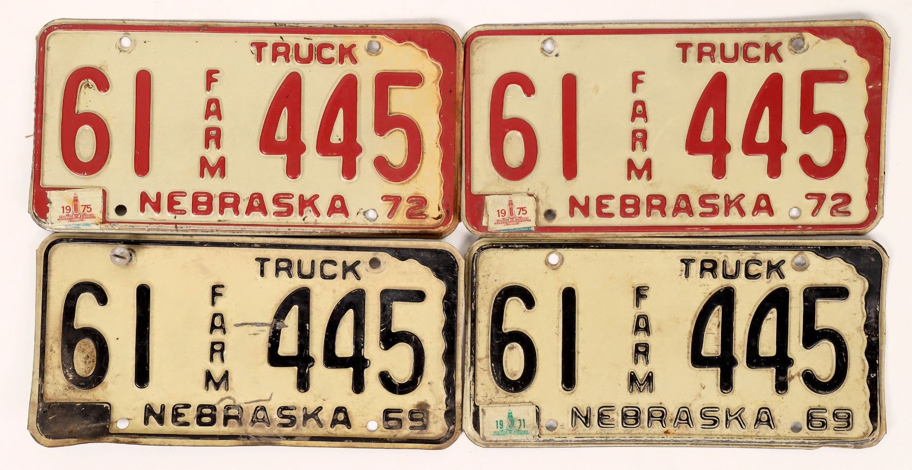 Group of four Nebraska Farm Truck license plates from 1969 with black lettering, one with'71 tag (2) and 1970 with red lettering, both with '75 tags (2). Nebraska