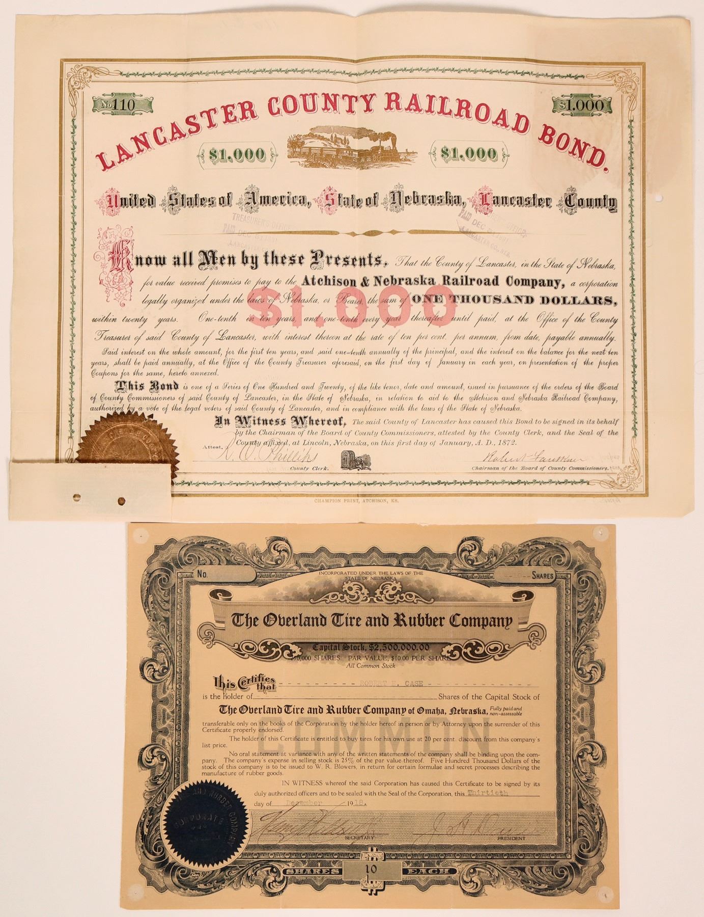1. Lancaster County Railroad bond - Rare $1,000 Lancaster County Railroad bond, cert. #110 w/1 coupon. Signed Robert Faulkner, Chairman of Co. Commissioners & R. O. Phillips, Co. Clerk. Gold train vignette / gold border w/ adhesive gold seal. Rail name in red. Auditor's notice that the bond is certified and issued by Lancaster, NB to Athchison & Nebraska RR Co on Feb 5, 1875, seal set on May 1, 1876 with gold seal and signed by J. B. Weston, auditor of state, registry no 1120 Vol. CR page 23. 2. Overland Tire and Rubber Company Stock Certificate - 1918. No number. 10 shares to Robert Case. Signed. Pin holes. Blue stamped seal. Early. The company produced tires into the 1970's.
