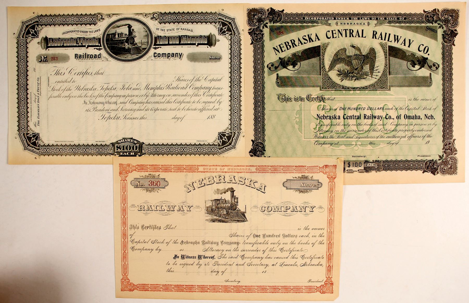 Nebraska, Topeka, , Iola and Memphis Railroad Co. Founded June 17, 1881 State of Kansas. U/U #213, $100 par, black, vignette top train l-r, printer American Bank Note Co. AU Ken Prag Collection