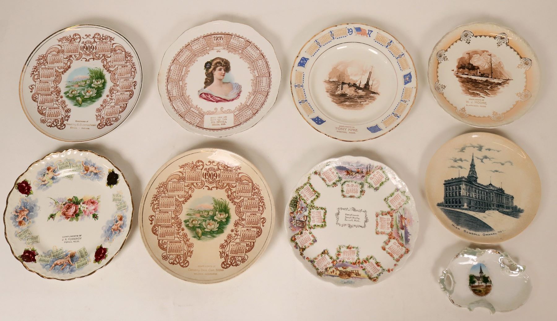 Lot of nine: 1) Dish approx. 6 x 4" Swedish Mission Church, Stonmsburg, Nebr. reverse stamps Wheelock Austria Vienna. Wheelock Made in Austria for Scott & Ericson Stomsburg, Neb; 2) Compliments of W.J. Moore Clarkson, Nebr, 8" Reverse stamp D.E. McNicol East Liverpool, O; 3) High School, Omaha, Neb. 7.75" Reverse stamp made for J.L. Brandeis & Sons Boston Store by Frank Beardmore Fenton England; 4) 1910 Calendar Plate Compliments Joseph Horky Farwell, Nebr. 9" Reverse stamp Homer Jaughlin Hudson; 5) 1908 Calendar Plate Merry Xmas and Happy New Year, Jos. Houska, Omaha, Neb 9.25" N.C. Co. E.L.O.; 6) 1909 Calendar Plate 9.5" Compliments of Housley & Butenschoen Elkhorn, - Nebraska. Reverse stamp America China Co. Toronto, Cal. USA; 7) 1911 Calendar Plate 9.5" Compliments of J.R. Pomeroy Ponca, Nebr. Carnation McNicol; 8) 1917 Calendar Plate, 9.25" Compliments of Tony Kriz, Weston, Nebr. Reverse Stamp D.E. McNicol East Liverpool, G.; 9) 1909 Calendar Plate 9.5" Compliments of Cerveny Bros. Gen, Mdse Wilber, Nebraska. reverse stamp illegible Nebraska