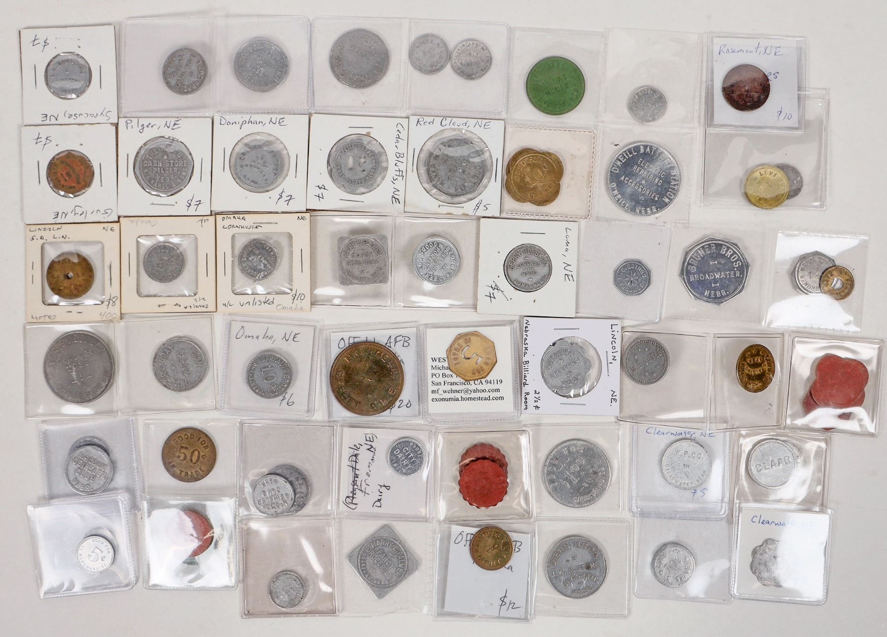 Diverse group (62) of tokens from Nebraska. Bradshaw, Red Cloud, Omaha, Syracuse, Clearwater, Lincoln, Offutt AFB, Doniphan, Pilger and many more.