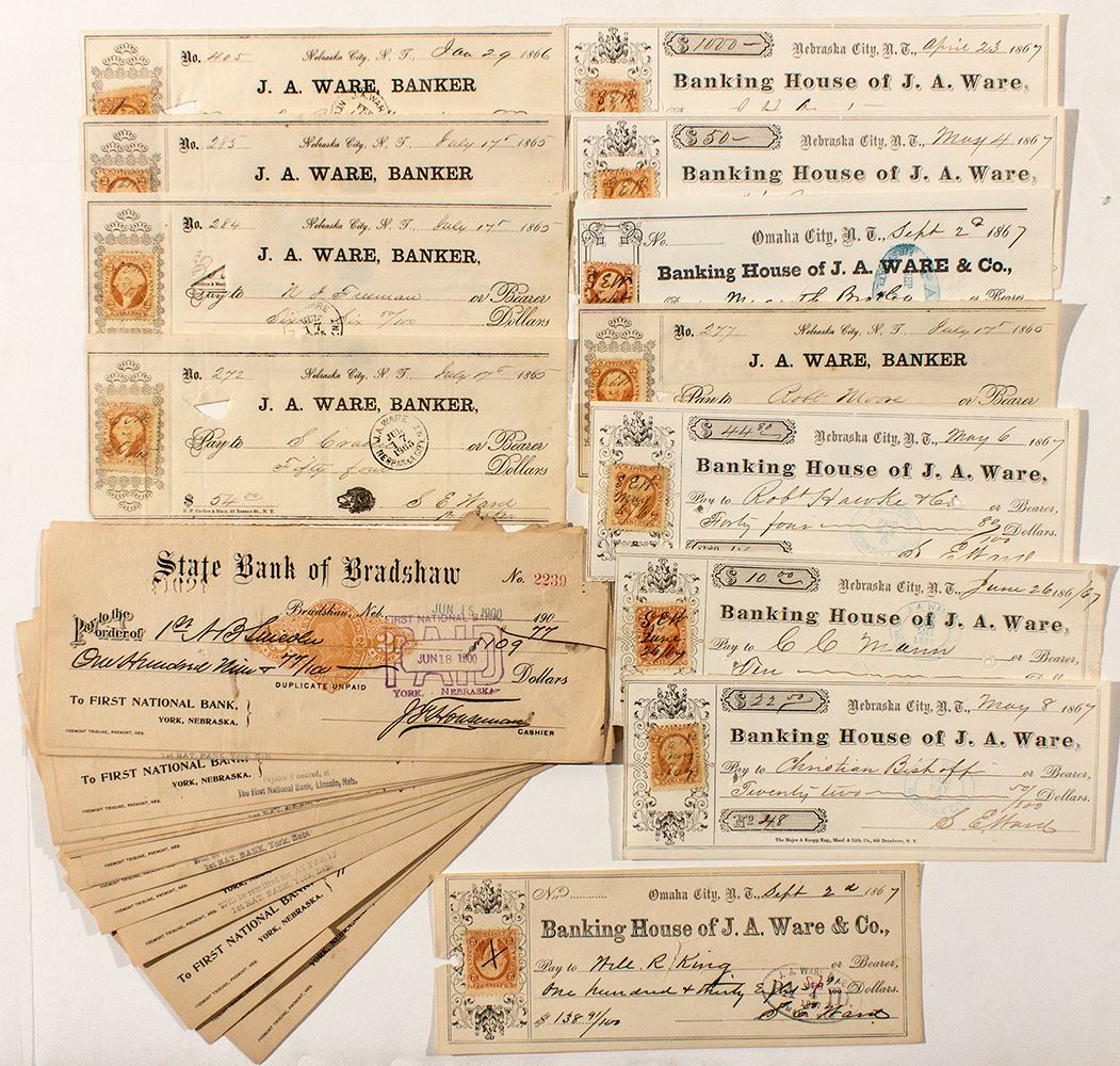 28 pieces. All have either RN or adhesive revenue. Seventeen State Bank of Bradshaw (c,1900) with RN- X. Eleven territorial checks from Nebraska City and Omaha City N.T. (1865-1867), all with adhesive revenue stamps. (Prag Collection)