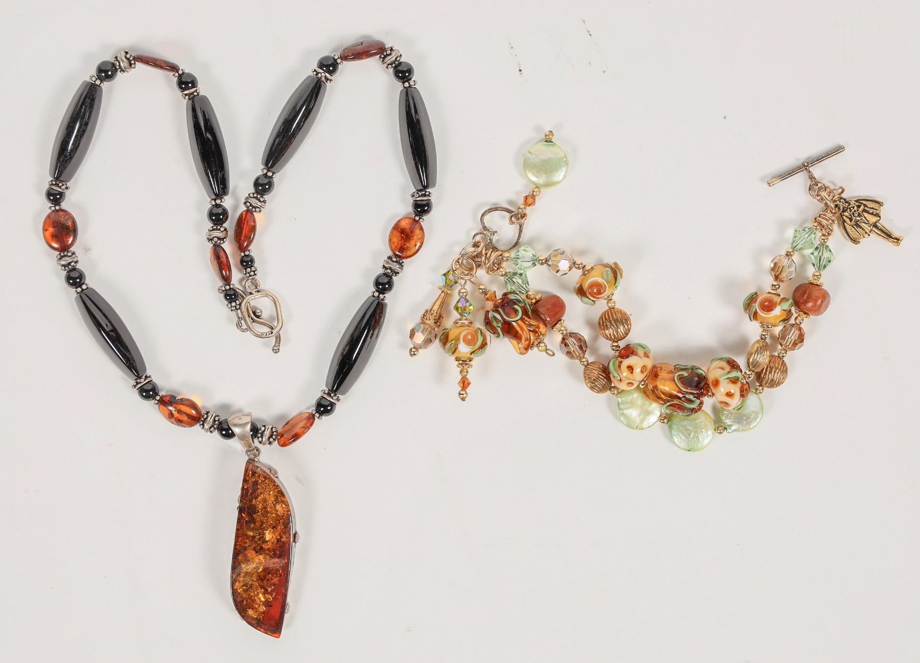 Necklace: 18 inch amber and black onyx; bracelet: amber beads and mother of pearl.