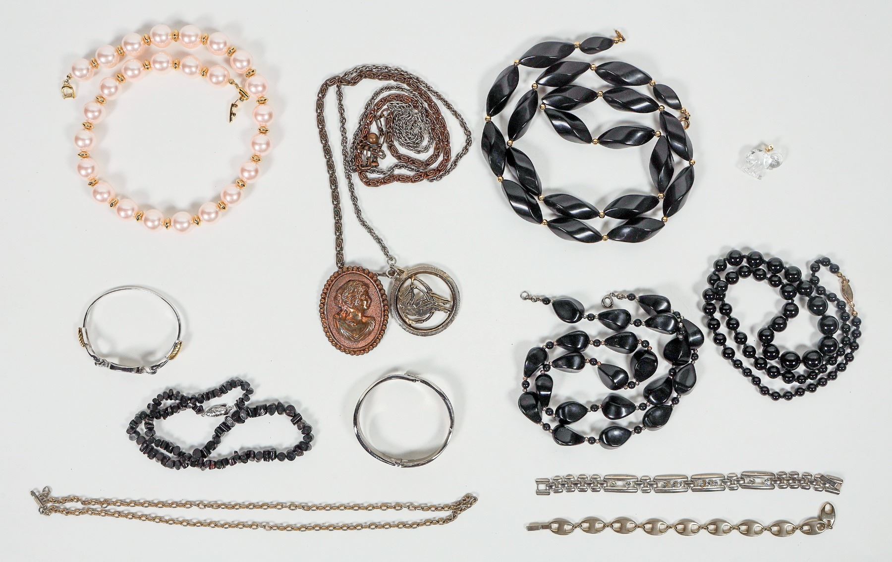 Costume jewelry: nine necklaces, four bracelets and a glass elephant pendant.