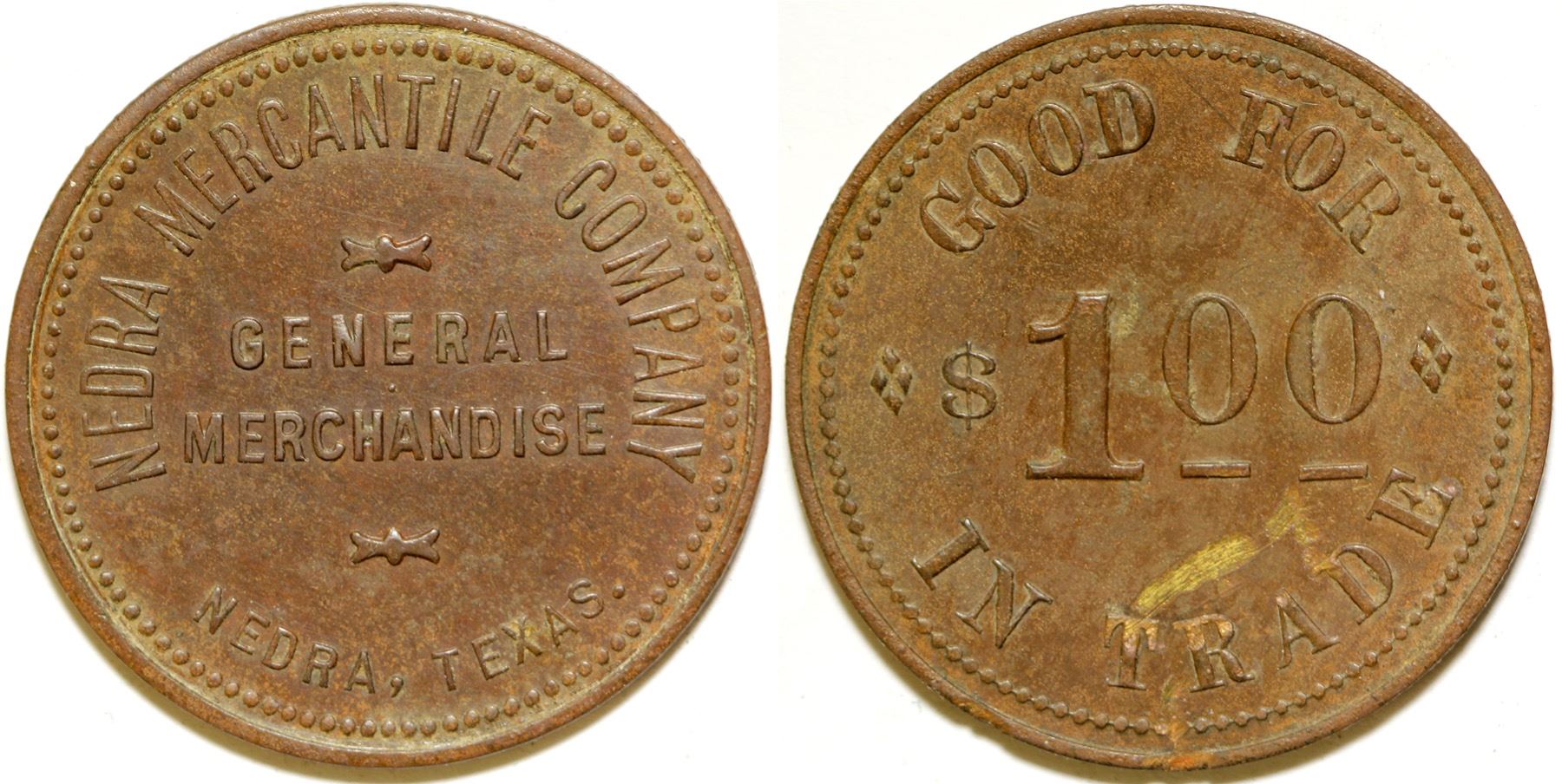 Obv.: Nedra Mercantile Company /General / Merchandise / Nedra, Texas; Rev: Good For / $1.00 / In Trade. Br. rd., 34 mm. State: Texas City: Nedra Date: HWAC# 84300