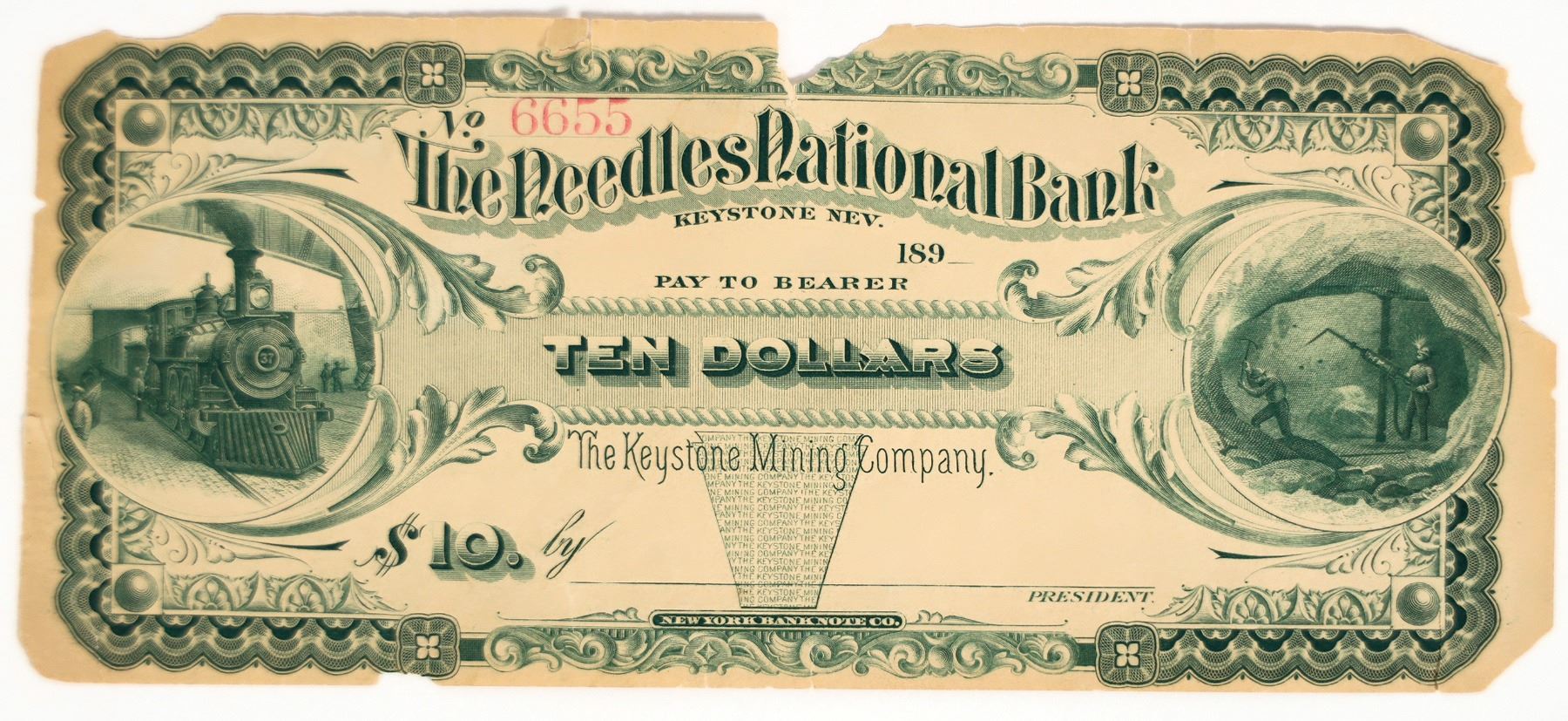 Issued by the Needles National Bank for the Keystone Mining Company of Keystone, Nevada. Unissued remainder bearer draft $10 note, one of the few reported remainders. Very rare, although it suffers from pieces out along the edges. (see our $1 note for a synopsis of the bank and the mining company). 7 x 3 inches.