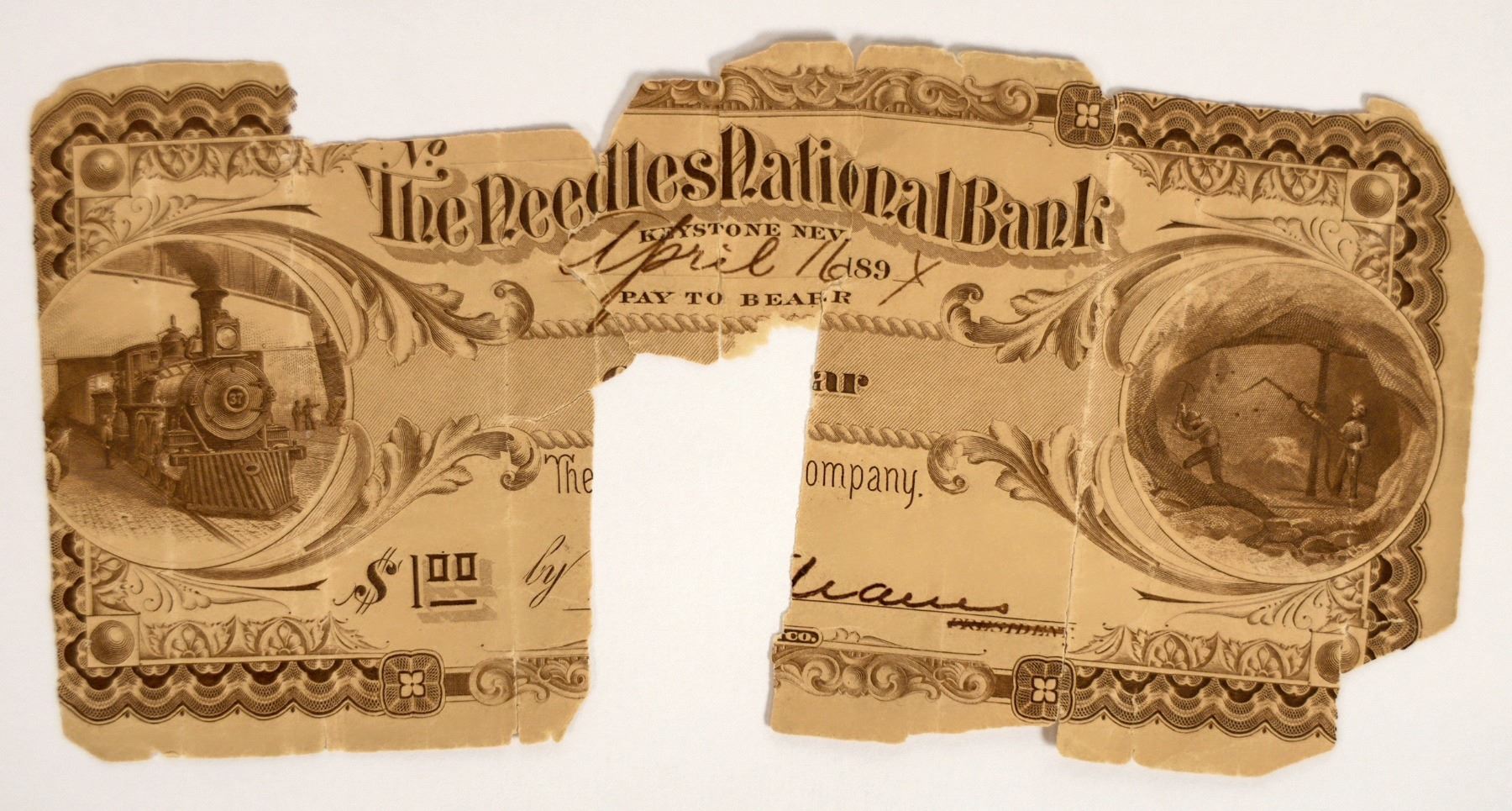 Needles National Bank, Needles, California, $1 issued bearer draft dated 1894 on the Keystone Mining Co., Keystone, Nevada. This partial note has missing pieces but is the only know example of an issued $1 note. The Needles National Bank only existed for two years, 1893 to 1895. During that time, it held an account on the Keystone Mining Co. at Keystone, Nevada. The Keystone Mine is located some five miles west of Goodsprings in Clark County, Nevada. It was a small producer, with a mill at Sandy, California, but the early management during the first years had another struggle. The Panic of 1893 made silver coins hard to get to meet payroll. Just as other Nevada mining companies had done, the Keystone Mining Co. had bearer drafts printed by the New York Bank Note Co. in $1 and $10 denominations. The experiment was a failure, and soon the Needles National Bank failed and the Keystone mine was sold. These notes state the Keystone Mining Co. was located at the Nevada town of Keystone, yet extensive research indicates there never was a town or even a camp named "Keystone."