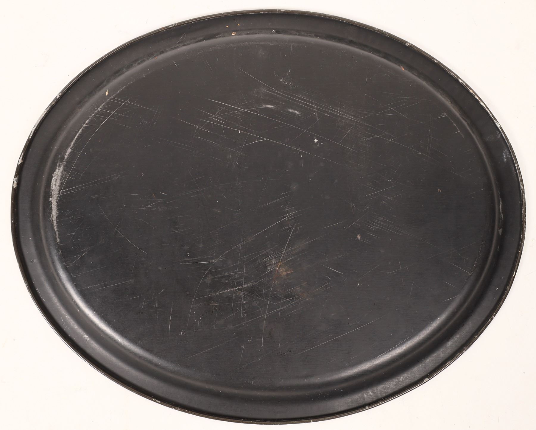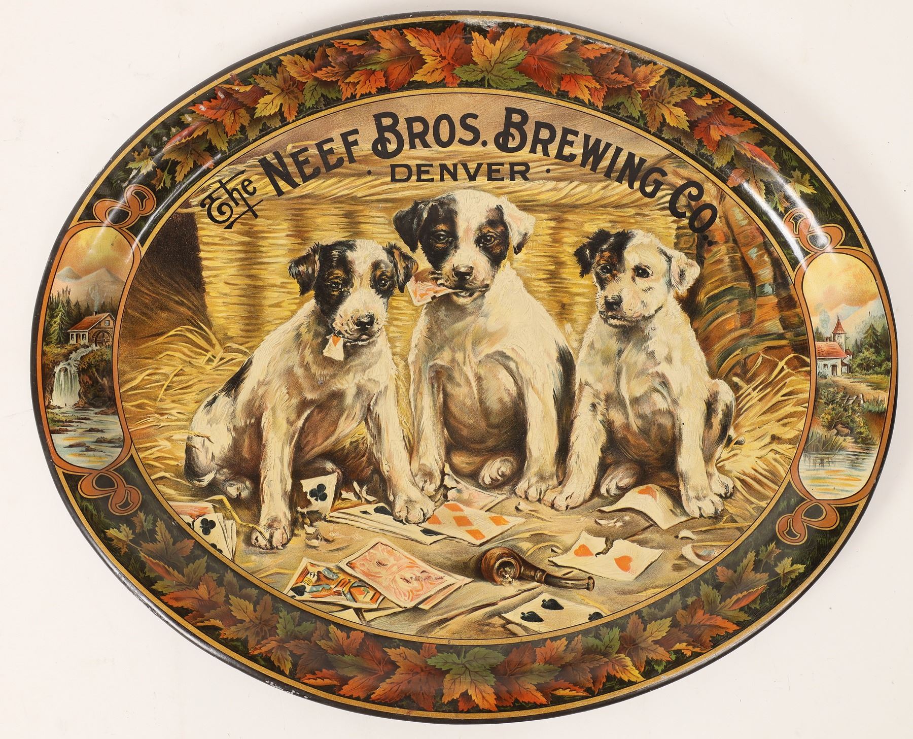 This beer tray provided by the Neef Brewing Company is an oval at 16.75 in. X 13.5 in. It depicts three puppies in trouble chewing up some playing cards. The outline edge of the tray has autumn leaves and cascading waters. C. 1891-1917. Very good condition. Denver Colorado c. 1891-1917