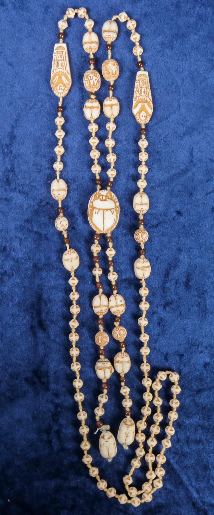 Vintage Neiger Brothers necklace Egyptian revival Czech pressed glass scarabs, mummies uranium white tan. Knotted and interspersed with garnet beads. 48 " long, plus scarab with two strings , additional 7" long-- needs to be double hung to wear.