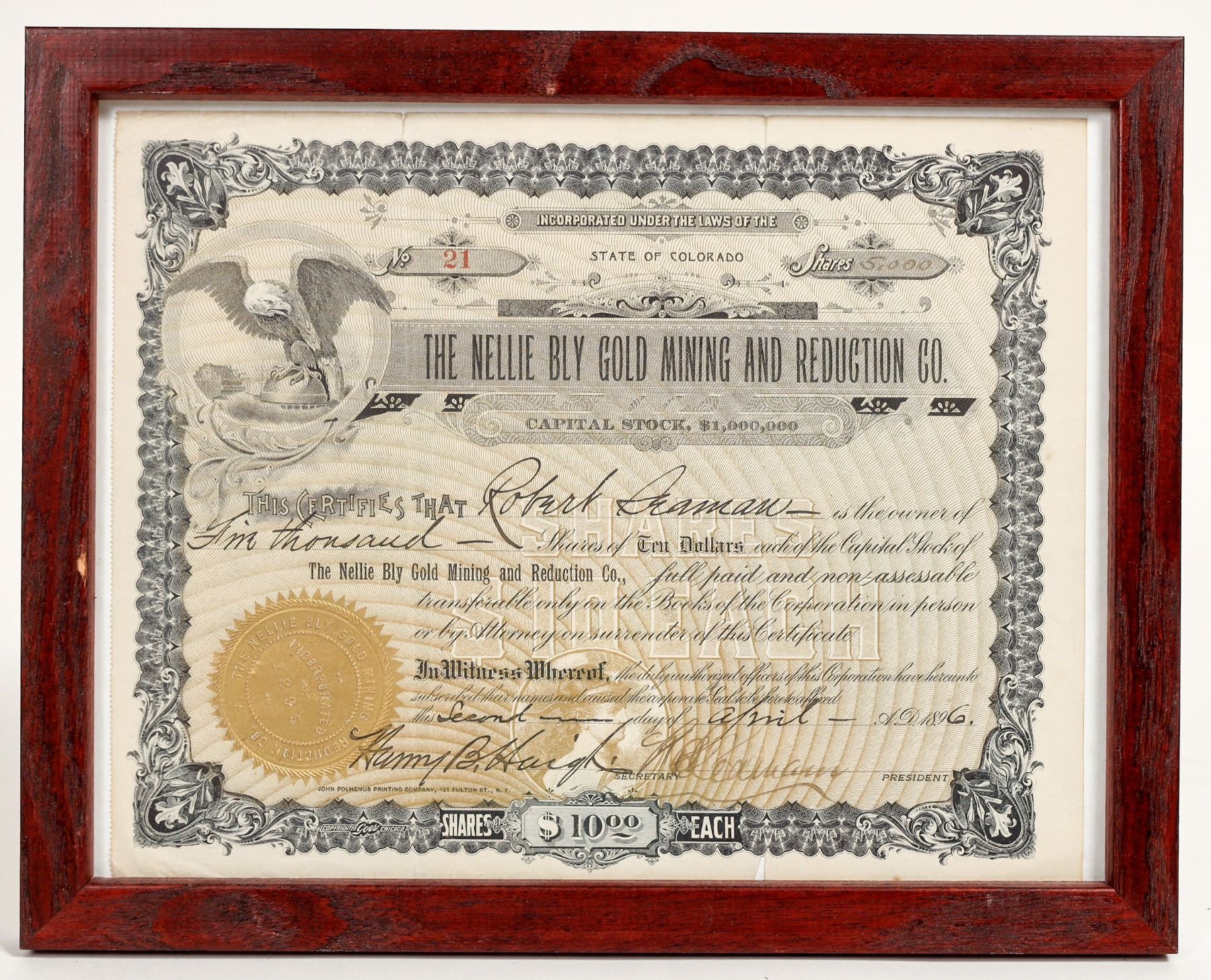 The Nellie Bly Gold Mining and Reduction Co. issued 5000 shares of stock to president Robert Seaman in 1896. Mill was located at Magnolia near Boulder. A few weeks after their wedding, Robert Seaman, Elizabeth Seaman (Nellie Bly), and four other directors incorporated the Nellie Bly Gold Mining and Reduction Company, duly recorded in the office of the Boulder County Clerk and Recorder. The company then built the elaborate and expensive Nellie Bly Mill, complete with roasting furnaces, an assay office, and sleeping quarters. It reached the height of its operation in 1899, but it only ran for a few months, processing gold ore from the nearby Keystone and Kekionga mines. The stock has two folds with foxing at the folds, an eagle vignette in the upper left side. Printed by John Polhemus of New York. Beautifully framed at 10 in. X 12 in. Please see photo for details.