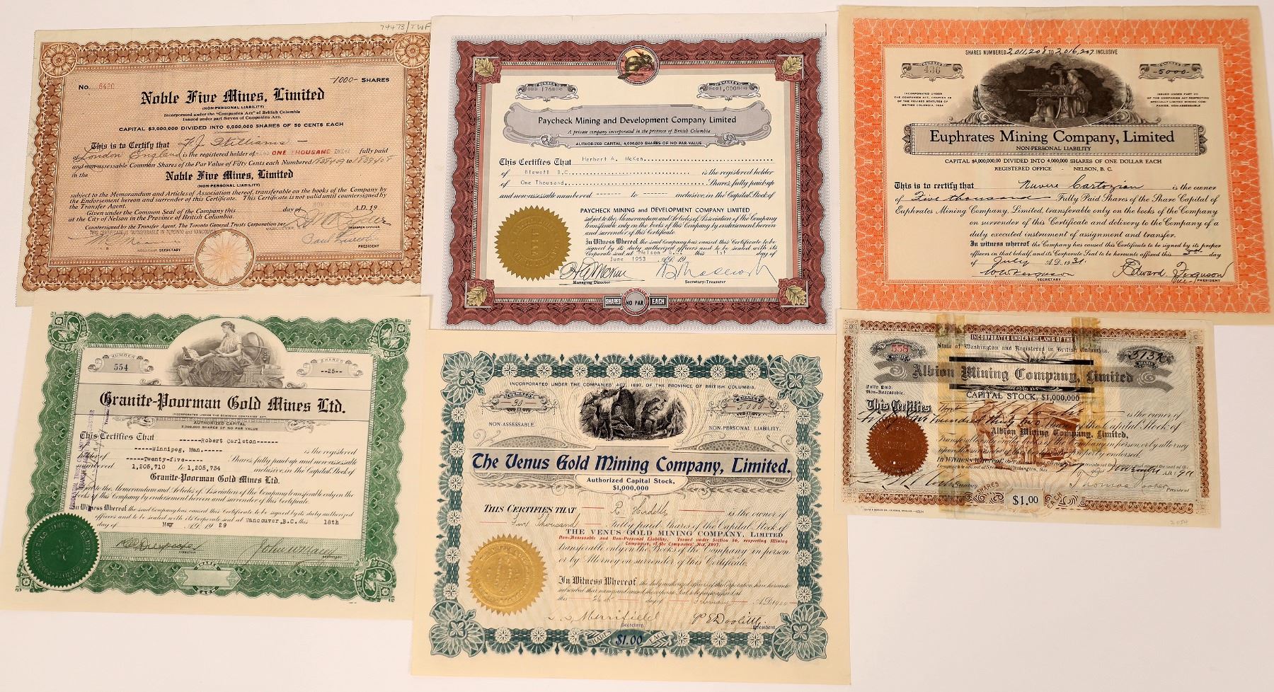 Lot of six. 1) Venus Gold Mining Company. # 30 issued in 1900. Listed as near Nelson. Signed by President Doolittle. He was a physician, inventor and the FATHER of the TRANS CANADA HIGHWAY. 2) Albion MC. 1911. Listed as 30 miles from Nelson. Registered in Washington. President Rooker was a Seattle realtor. 3) Granite Poorman Gold Mines. 1929. 4) Euphrates MC. 1931. Listed as on the Salmo River about 7 miles from Nelson. 5) Paycheck Mining and Development. A later 193o's stock, but VERY STRIKING. 6) Noble Five Mines. 1929. Its first claim in the area was in 1891.
