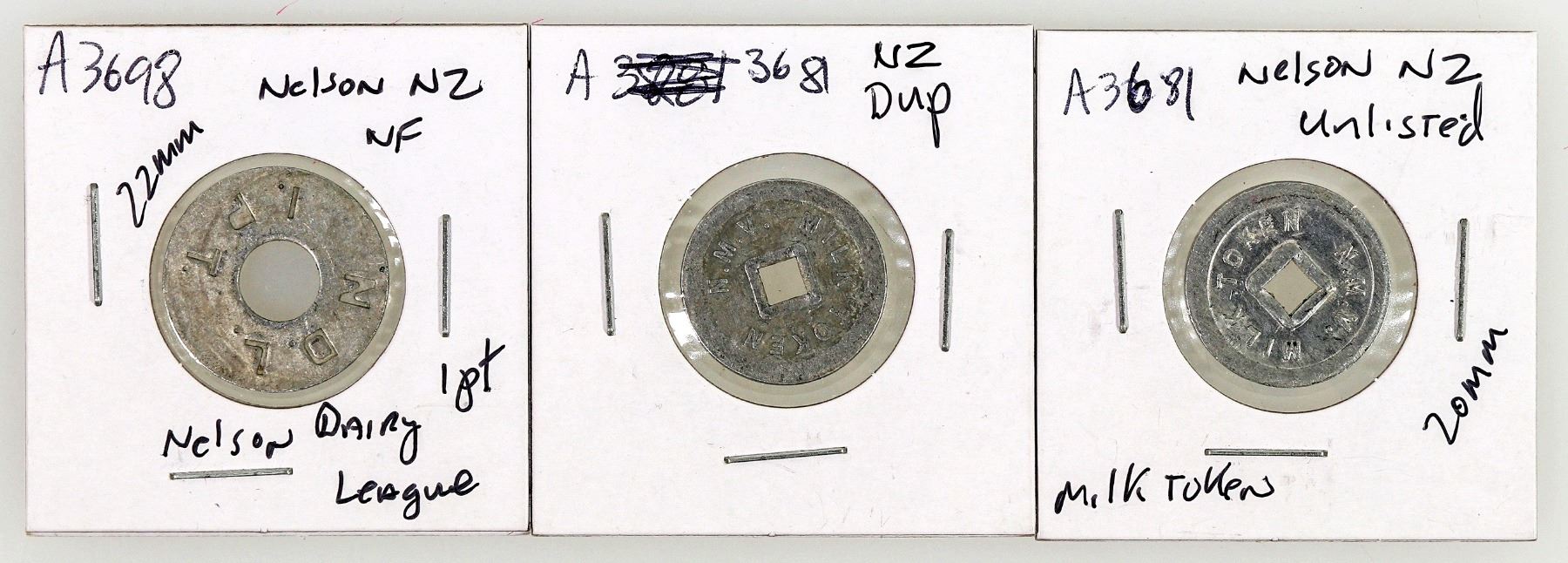 Three tokens: two are 20 mm: N. M. V. Milk Token; Al., rd., square cut out. The other is 22 mm: N. D. L. / I. P. T.; circle cut out.