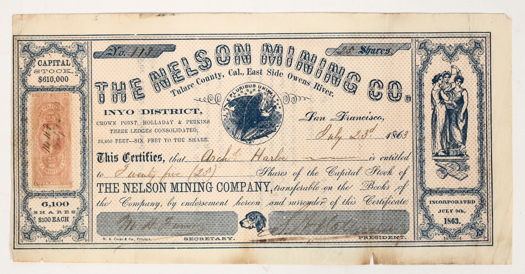 Rare Tulare County location on the EAST SIDE OF THE OWENS RIVER. #113 for 25 shares to Harbe. Signed by secretary M H Furman and president SW (?). Dateline San Francisco 1863. Incorporated July 9, 1863. 25 cent revenue stamp. Not cancelled. Location: Tulare County, Cal., East Side of the Owens River. "Inyo District / Crown Point, Holladay & Perkins / three ledges consolidated / 36,600 feet - six feet to the share!" Two small vignettes: Eagle and allegorical. Blue on pink safety paper. WE Cooke & Co. printer. Deep folds, some tears and soiling. On September 13, 1863 the Daily Alta California reported the Nelson was about to commence work as their teams with provision and tools had arrived. After that we could find no more information on this company.
