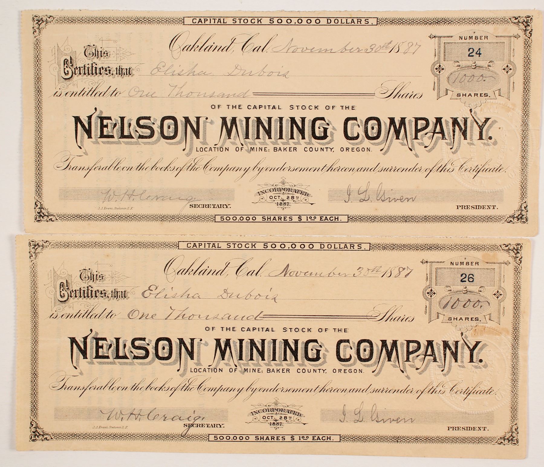 Lot of two. 1) # 24 for 1000 shares to Elisha Dubois. Signed by JL Given president and secretary WH Craig. Location of mine, Baker County, Oregon. Dateline Oakland 1887. Incorporated October 28, 1887. JJ Evans printer. 2) Same as 1 except # 26. Some staining on #26. Both have holes where stamp was applied. Mine was sold by W. Nelson for $300,000 to the Nelson Mining Company. Oly $35,00 in cash and in 1890 W. Nelson was going after the rest of the money owed him. Ken Prag Collection