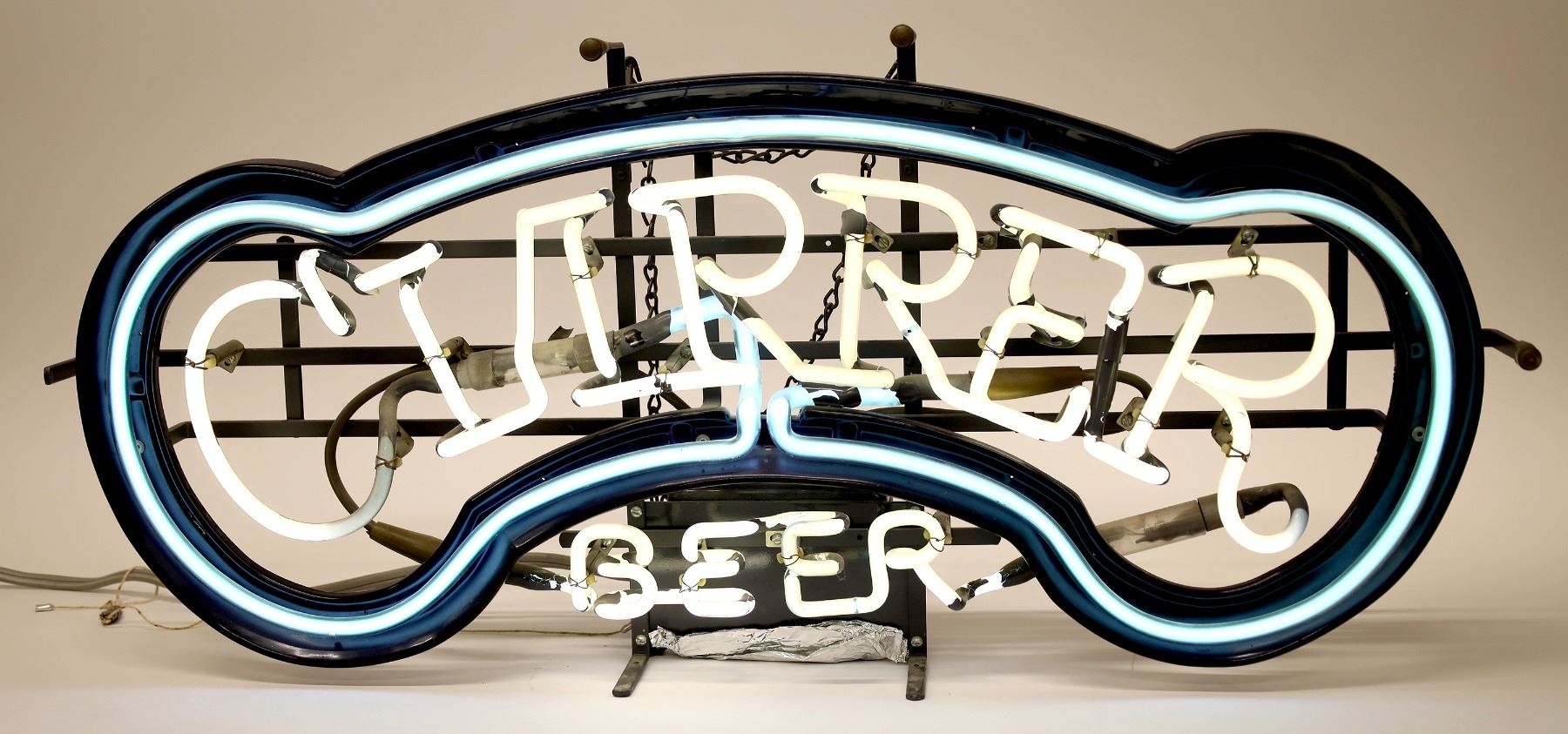 Cool blue and beige neon sign advertising Clipper Beer. Made by the Mt. Vernon Neon Sign company of Illinois. 30 inches wide, 15 inches tall.