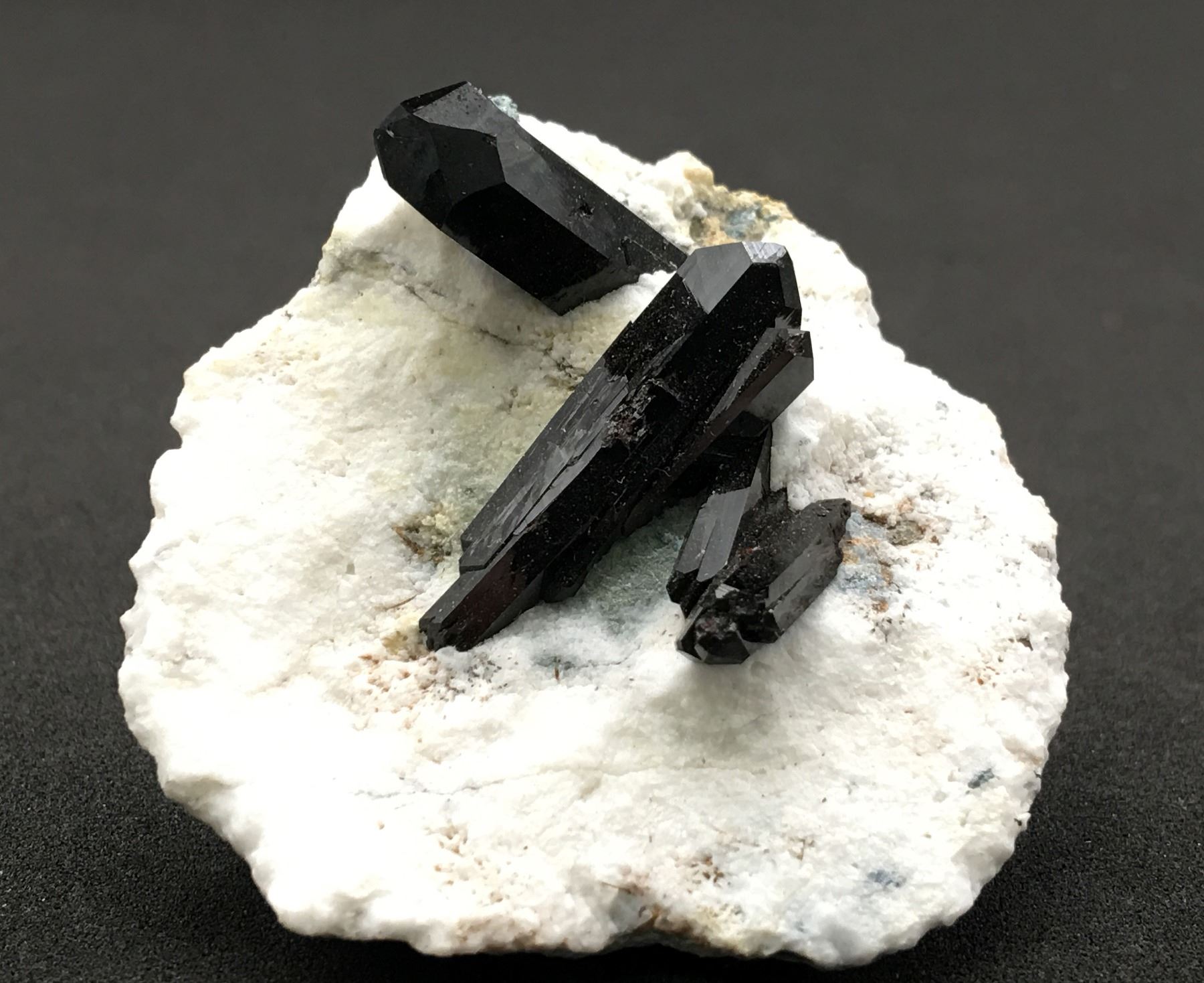 An attractive, classic specimen of this unusual silicate of potassium, sodium, lithium, iron, manganese, and titanium. The Benitoite Gem Mine (Dallas Gem Mine) has produced the world's finest known crystals of neptunite. At the "macro scale" neptunite appears to be jet black in color, but, it is actually a deep maroon reddish-brown. This color is apparent when macro crystals are viewed in strong light at sharp angles, in microcrystals, or when prepared in thin section. When found most neptunite crystals from San Benito Co., California are embedded in a thick vein-filling of the mineral natrolite. Specimens from this locale are prepared for collectors by dissolving some of the surrounding Natrolite in acid to expose the Neptunite crystals. This specimen shows the rare, blackish, highly lustrous, prismatic neptunite crystals on a nicely contrasting white colored natrolite covered matrix ... a very aesthetic mineral specimen. Dimensions (cm): 2.8 H x 4.7 W x 5 D. Location: Benitoite Gem Mine, San Benito County, California, USA