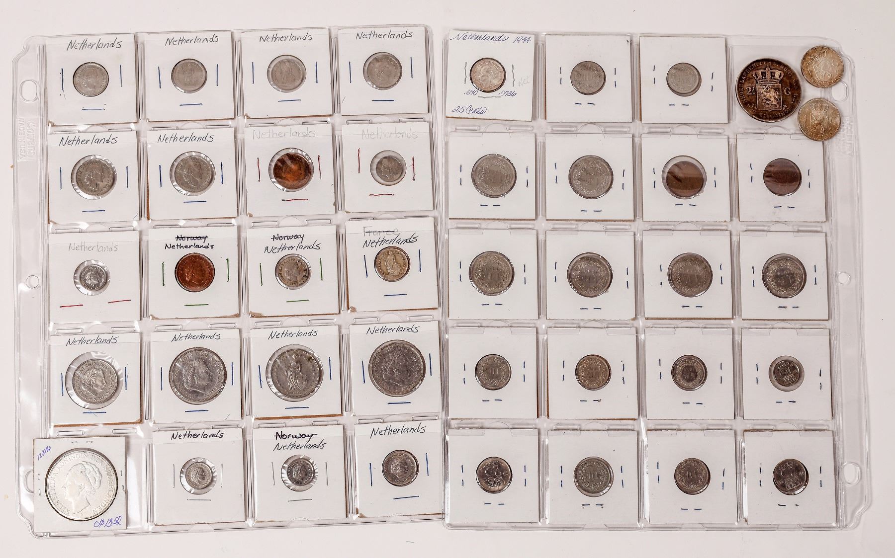 Lot of over 40 coins from Netherlands. 1845 two and a half gulden, AG; 1930 two and a half gulden, F-VF; 1944 twenty five cents, EF-AU; 1957 one gulden, F-EF; 1957 one gulden, EF-AU; 37 smaller denominations: 5, 10, 20 cents; 1 franc, 2 franc (1960s-1970s).