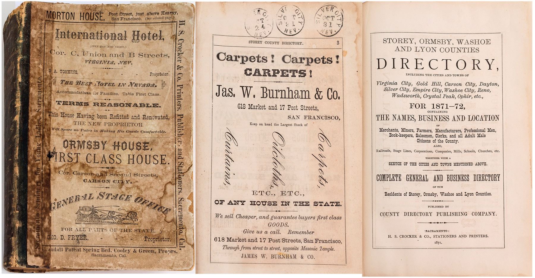 Five copies listed as known in Quibedeux. "Storey, Ormsby, Washoe & Lyon Counties Directory, Including the Cities and Towns of Virginia City, Gold Hill, Carson City, Dayton, Silver City, Empire City, Washoe City, Reno, Wadsworth, Crystal Peak, Ophir, etc., for 1871-72, Containing the Names, Business and Location of Merchants, Miners, Farmers, Manufacturers, Professional Men, Book-keepers, Salesmen, Clerks, and all Adult Male Citizens of the County. Also, Railroads, Stage Lines, Corporations, Companies, Mills, Schools, Churches, etc. Together with a Sketch of the Cities and Towns Mentioned Above. Complete General and Business Directory of the Residents of Storey, Ormsby, Washoe, and Lyon Counties."