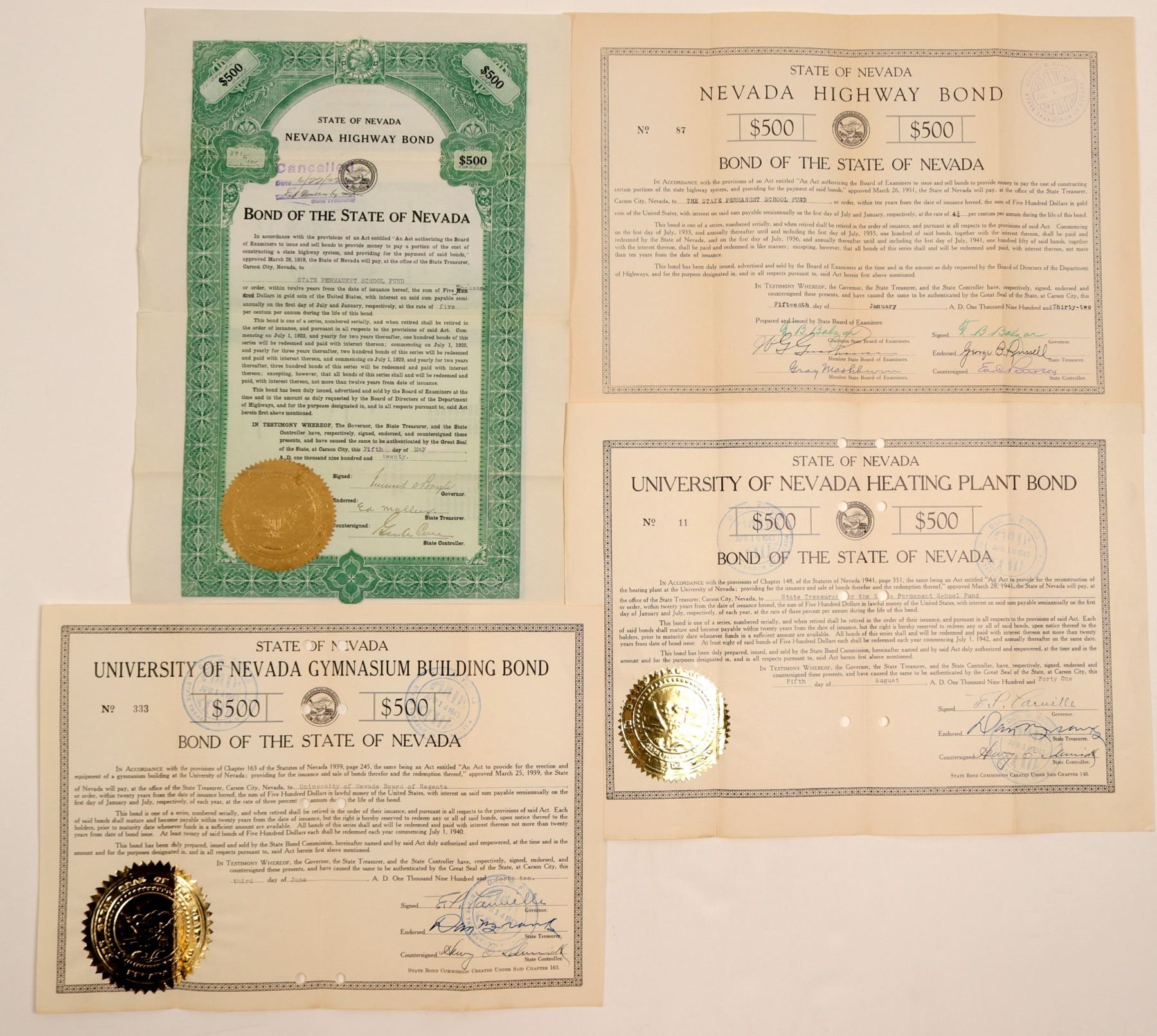 Lot of four. 1) Green $500 bond signed by Governor Balzaar. 1920. Very rare: numbers 317 to 380 inclusive. That equals $5,000. Issued to State Permanent School Fund. This would have been shortly after Nevada joined with other states to complete the Lincoln Highway. However, travel along the Lincoln Highway in Nevada in 1920 included heavy sand, rutty dirt roads and lots of troubles! Rare 1920 Bond that is not cut cancelled. 2-4) 1932. Signed by Governor Balzaar and Carville. Numbers 11, 87, and 333. Issued to School fund and University of Nevada.